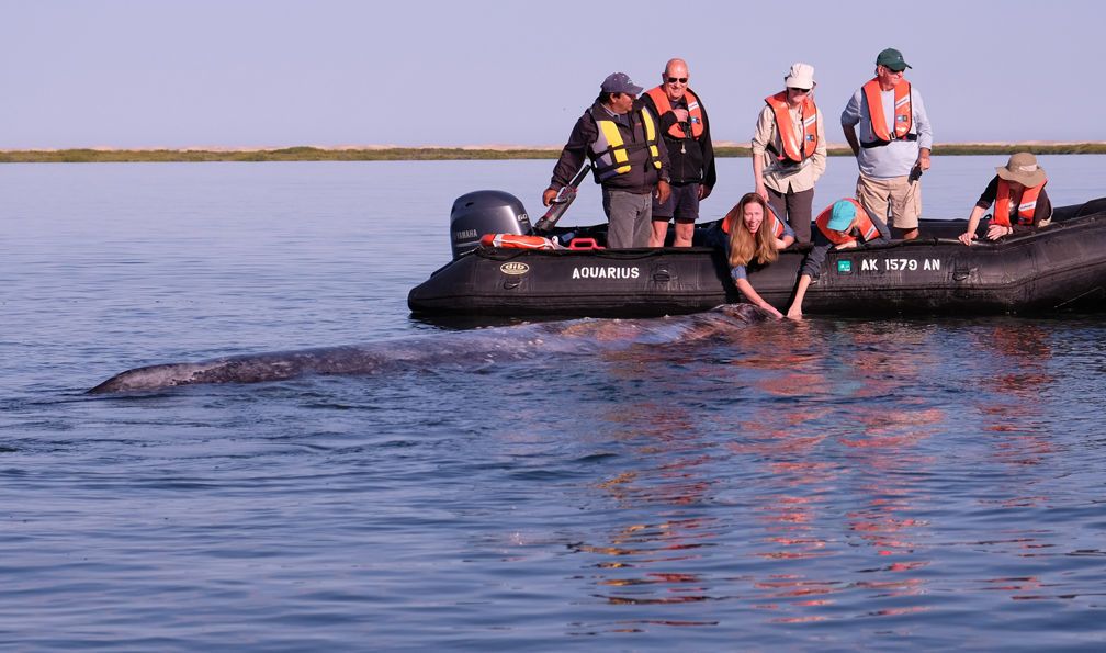 This morning, National Geographic Venture docked at the interesting port, San Carlos. From the 1940s to the 1990s, the port was used for loading agricultural products and fertilizers from the nearby Santo Domingo Valley. Nowadays, San Carlos is basically a place for loading sardines from a local cannery. It is also an important tourist base for whale-watching, principally mating gray whales. At the port, all guests and staff boarded buses to Lopez Mateos, a town located near the northernmost tip of Magdalena Island. The buses traveled across Magdalena Plain, a section of the Sonoran Desert that receives a lot of moisture in the form of dense fog from the Pacific Ocean. Lichens and orchillas, a type of flowering plant, give the desert a phantasmagoric appearance. Guests and staff enjoyed spotting numerous birds, including crested caracaras and kestrels. Once in Lopez Mateos, we boarded local pangas for whale-watching. During two rounds of whale-watching, we encountered several whales close to our pangas. However, most of the whales were preoccupied with traveling, searching for mates, or just finishing their time of reproduction and thus exiting the lagoon. In reality, the whales were not interested in interacting with the boats and their excited cargo, but we had many opportunities to observe the behavior of these magnificent animals. In town, we all delighted in a delicious fish lunch, ‘pescado zarandeado.’ We enjoyed exploring the local dock with its many colorful shops and crafts, and we admired the wonderful sculpture of a cow-calf pair of gray whales.