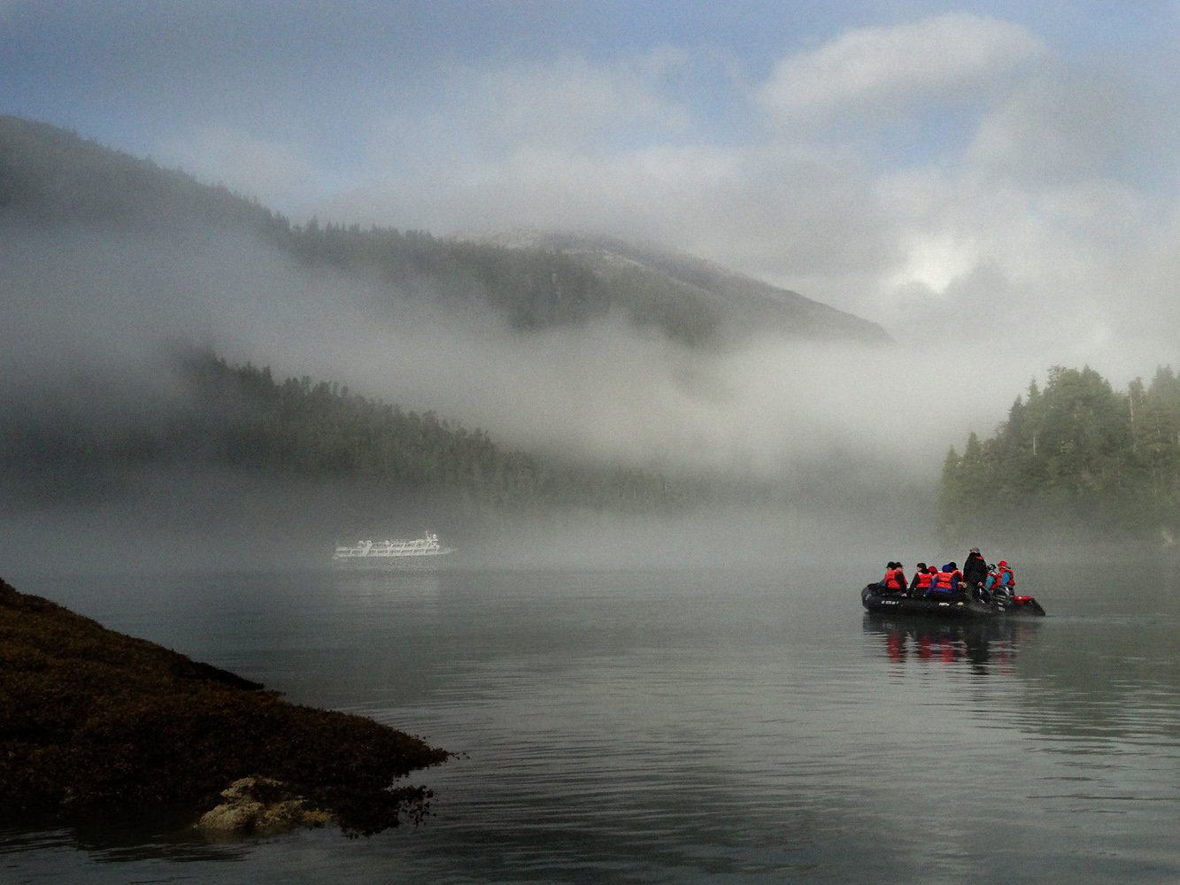 Throughout the night National Geographic Sea Bird motored briskly towards a morning anchorage at Takatz Bay, which is deeply incised into the mountains of Baranof Island. Cottony layers of fog enveloped the ship as we entered the sheltered waterway to explore the shorelines by kayak and our trusty inflatable boats. Wisps of fog laced the steep hillsides clothed with Sitka spruce, western hemlock, and Alaskan yellow cedar. Kayaking is a marvelous means of silently gliding along at one’s own pace to enjoy the pristine beauty of this wild place. Those who cruised with naturalists traveled farther towards the mouth of the bay as the fog reluctantly lifted. Eagles and kingfishers perched in the lichen-festooned trees, and a mink and playful family of river otters appeared for a few lucky observers.