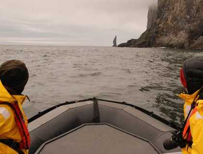 Along the southern side of the island limestone cliffs rise to about 300-400 meters, covered with breeding seabirds: common and thick-billed murres, kittiwakes, and fulmars. Add also mystical tunnels, caves and strong currents, tides, swell, and waves from several directions. Those who reached as far as the very southwest corner of the island also saw the figurehead, “The Needle,” standing on its own looking out over the ocean like the stone heads at Easter Island. You have one on the most magical Zodiac cruises you can do in the world.
