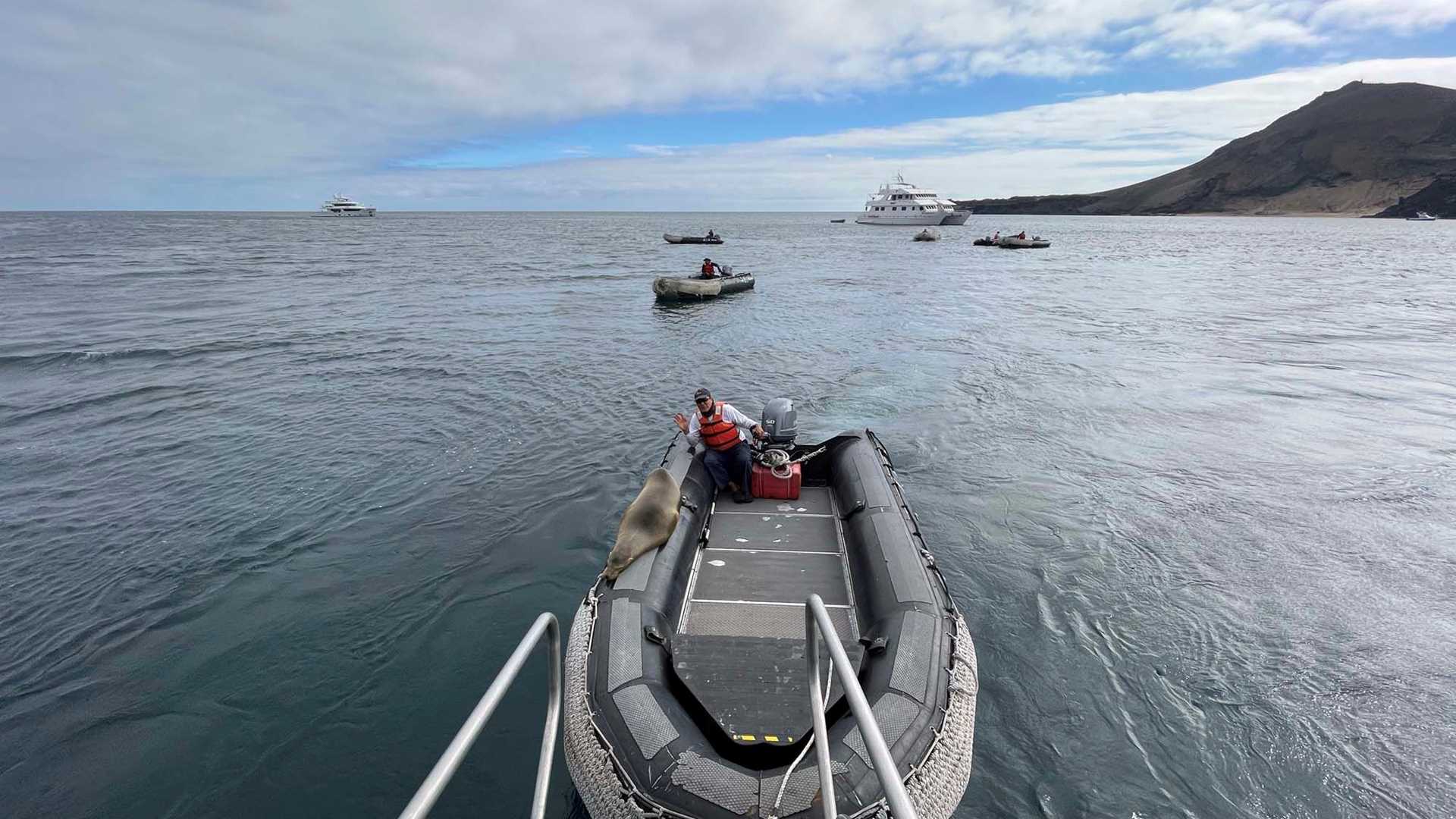 The morning temperature was very pleasant and towards the end of the hike, we spotted lava lizards sunbathing as well as a lonely finch looking for small seeds. Later, we went ashore to the beach and got a surprise visitor, a curious and tired female sea lion was sleeping comfortably on one of our Zodiacs. She was very relaxed and even slept through the ride to the shore and back. Eventually, she jumped back into the water and swam away.