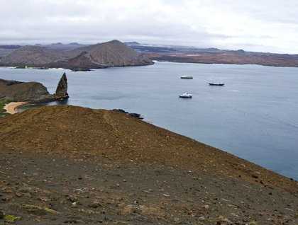 Our pre-breakfast outing this morning was fantastic. We hiked to the summit of Bartolome Island, a tiny little island full of geological wonders. Named after Bartholomew Sullivan, the 2nd Lieutenant on board the Beagle, Bartolome is the perfect site to explain the geological origin of the islands and the arrival of colonization and of species over thousands or even millions of years. Lichens and pioneer plants such as lava cactus and the endemic “tiquilia nesiotica” are the organisms that cause the bio-erosion of the lava, converting it into soil where other less-adapted species will be able to survive.
