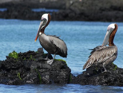 During the afternoon we navigated towards Chinese Hat; this visitor site is a satellite islet of Santiago Island. We anchored and got our Zodiacs ready for the explorers. We decided to go deep water snorkeling along the coast of Santiago. The water was a bit warmer; we were lucky to encounter more sharks, marine iguanas feeding out of the water, and some Galápagos penguins. Several species of sea stars were covering the ocean floor; some coral heads and sandy bottoms were the main habitat for several species of fish. After snorkeling, some of us went on a Zodiac ride along the resting and nesting grounds of the Galápagos penguins. It was just odd to find penguins near the Equator, and even more rare to find penguins on a lava flow with cacti in the background. But again, this is Galápagos so everything is possible to amaze us!