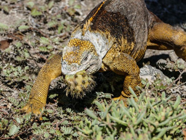 Today, National Geographic Endeavour II visited Cerro Dragon, located on the north part of Santa Cruz Island. We found one of the largest colonies of land iguanas. During our hike, we spotted the iguanas all around the trail. Some basked on the vegetation, and others were active. We saw the zigzag head movement they use to protect their territory and impress females. An Ecuadorian buffet lunch was set up in the dining room. We started with the traditional ceviche and ended with tres leches for dessert! We enjoyed snorkeling and Zodiac rides. We observed wildlife all over the place, including spotted eagle rays, sharks, blue-footed boobies, great blue herons, marine iguanas, and hundreds of other animals. They all reminded us why the Galapagos is so special.