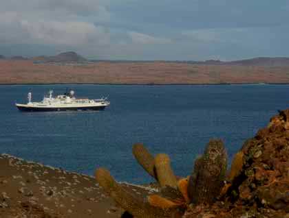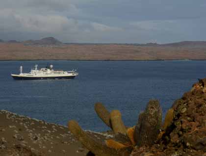 So, our early adventure brought happy guests back on board. We enjoyed it, felt like “early birds getting the worms,” and the activity was fantastic. As we approached National Geographic Endeavour breakfast smelled great, we recovered our energy, and a few minutes later we jumped on one of the two beaches that forms a nice bay, decorated by the famous Pinnacle Rock, to snorkel, swim, or rest on the beach sunbathing. The water is warm, and after all our groups disembarked and suited up the beach looked empty, because everybody was in the water. Usually this spot is great for snorkeling, and indeed today sharks, rays, turtles, and penguins were seen.