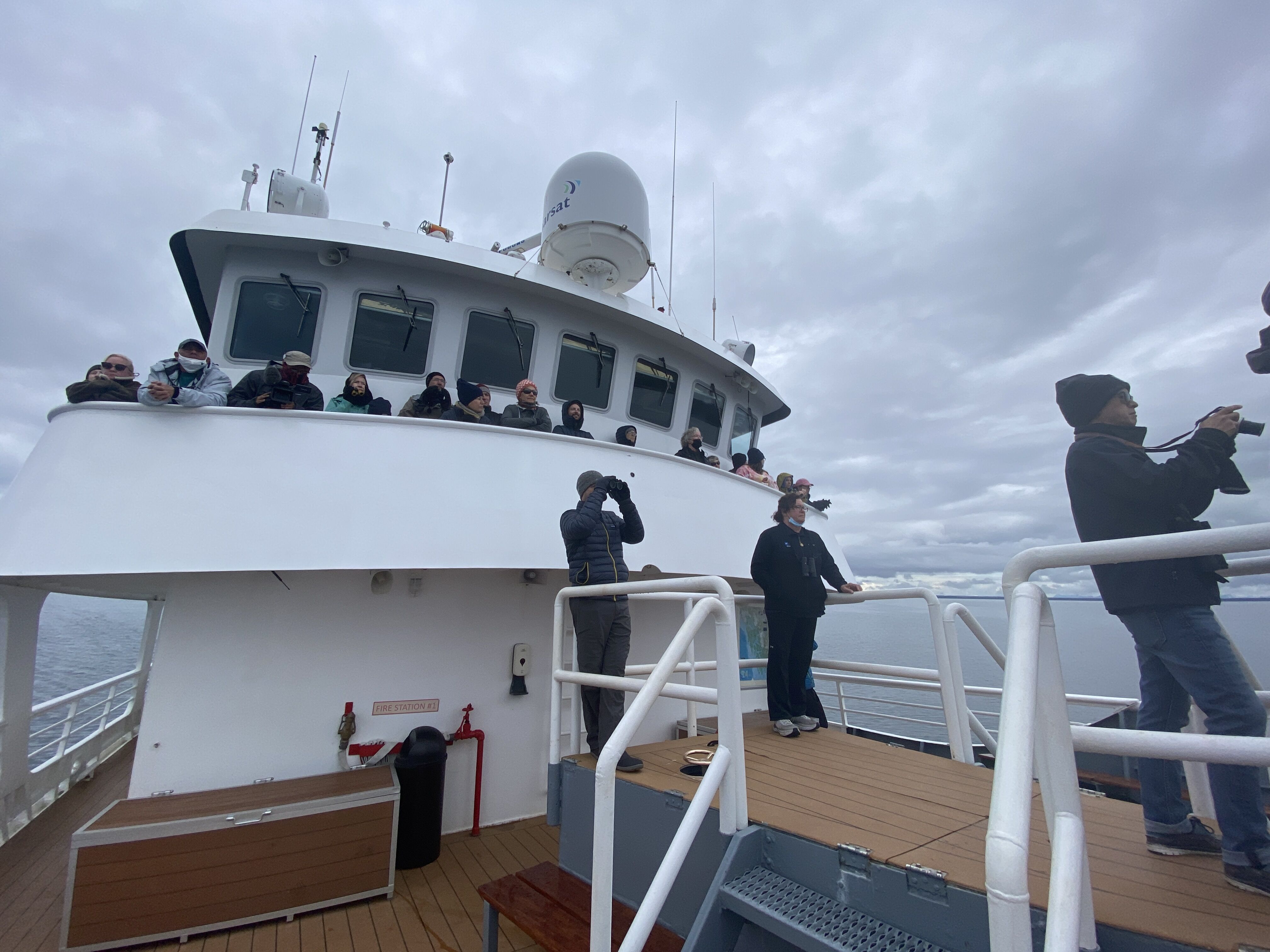 In between packing and editing photos, our last afternoon onboard included presentations from undersea specialist Rory and polar bear expert Kerstin. Following Captain Aaron Wood’s farewell cocktail party and another excellent dinner by the amazing dining team, our trip would not be complete without one last interruption by wildlife. This time we sighted fin whales out along the deep-water shelf. Then we watched the voyage slideshow put together by our photo instructor, Michael, and reminisced on an incredible trip around Svalbard.