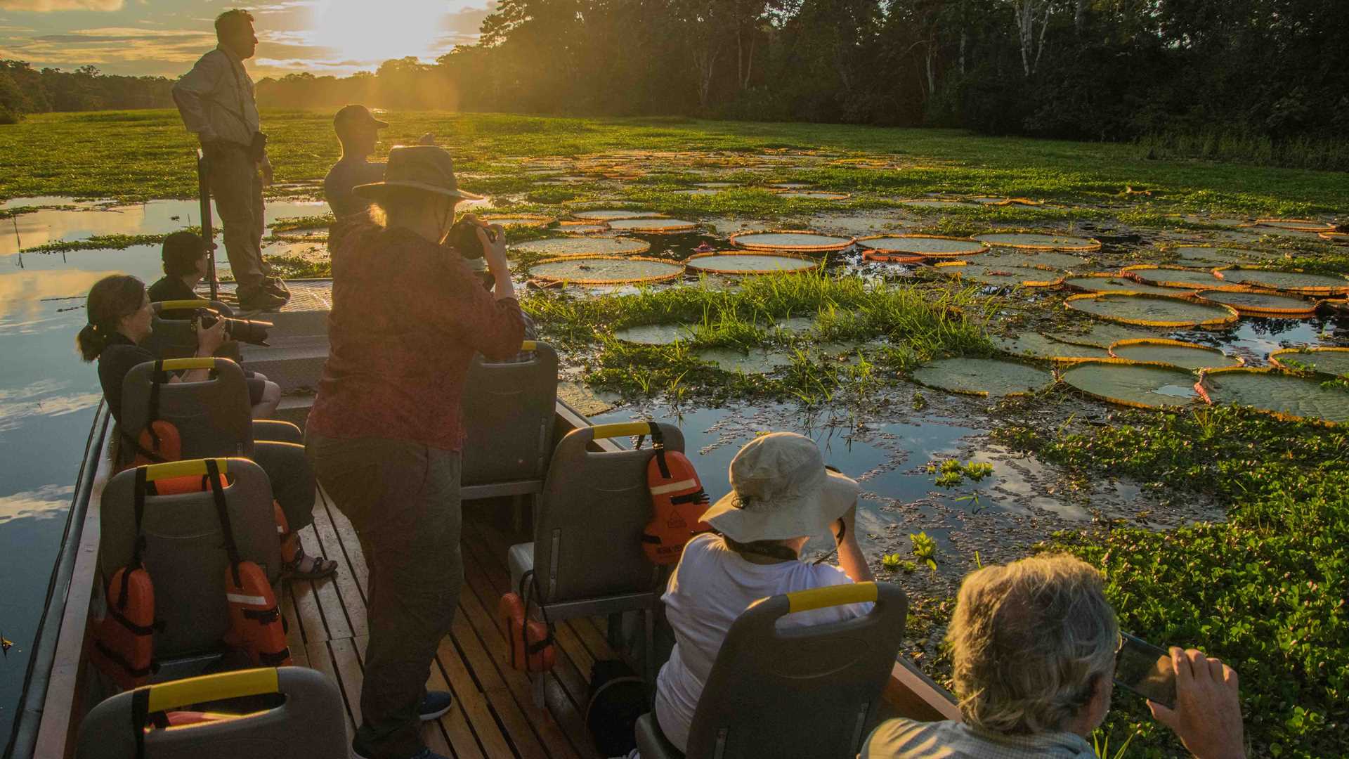 Today we started very early in the morning with a skiff ride around Belluda Caño. In this bird-watchers’ paradise, we spotted five different species of raptors, including several yellow-headed caracaras, a black-collared hawk, a road-side hawk, an osprey, and two great black hawks. We also spotted a couple of night-owl monkeys with a baby. They stared at us with their large, curious eyes. With great excitement, we came returned to the ship for a well-deserved breakfast. For the rest of the morning, we enjoyed presentations on ecology, the behavior of monkeys, and local medicinal plants. After lunch, we had a session about iPhone photography, and later on, we cruised on Zodiacs around El Dorado River. The light was just spectacular, as well as the many incredible encounters, including capuchin and squirrel monkeys, hawks, parrots and a gorgeous lake with gigantic lily pads. We stayed late after sunset, so we also had the opportunity to spot several caimans on the river. After our return to the Delfin II, we happily shared our experiences over a cold drink at the bar.