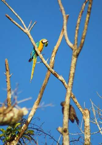 Our adventure in the Amazon took us this morning to the exploration of both the Ucayali River and Belluda Caño, the latter a creek known for both its beauty and abundance of wildlife. As we motored our way along the Ucayali, we encountered what is called locally as “Aguajales,” which are nothing more than a type of palm tree, a favorite location for the blue-and-yellow macaws. As we searched the sky with our binoculars, their unmistakable call gave them away, and in no time we had four of them perching on a nearby tree. Satisfied with our encounter—and our pictures—we moved on to keep looking for more! The pre-breakfast outing turned out to be a total success, but it was time to energize our bodies and we headed back to the ship for a delicious breakfast.