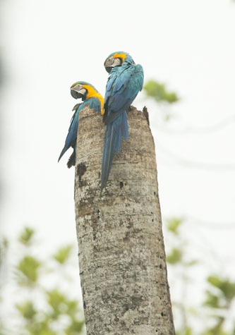 We embarked the skiffs to head into a narrow "caño," which is the local name for the tributaries of the main rivers. Belluda Caño is located near an "aguajal," or "aguaje palm jungle.” This particular species of palm (mauritia flexuosa) is the main nesting site for several species of macaws. As we headed out for our early skiff ride, the harsh calls of magnificent birds emerged from the aguajal. After scanning with our binoculars in the direction of the calls, we saw a pair of blue and yellow macaws. Several others flew by a couple times. At the same place, red-bellied macaws share the habitat and nest in the hollow aguaje palms. It is amazing to see the beauty of these intelligent and colorful birds in their natural world!