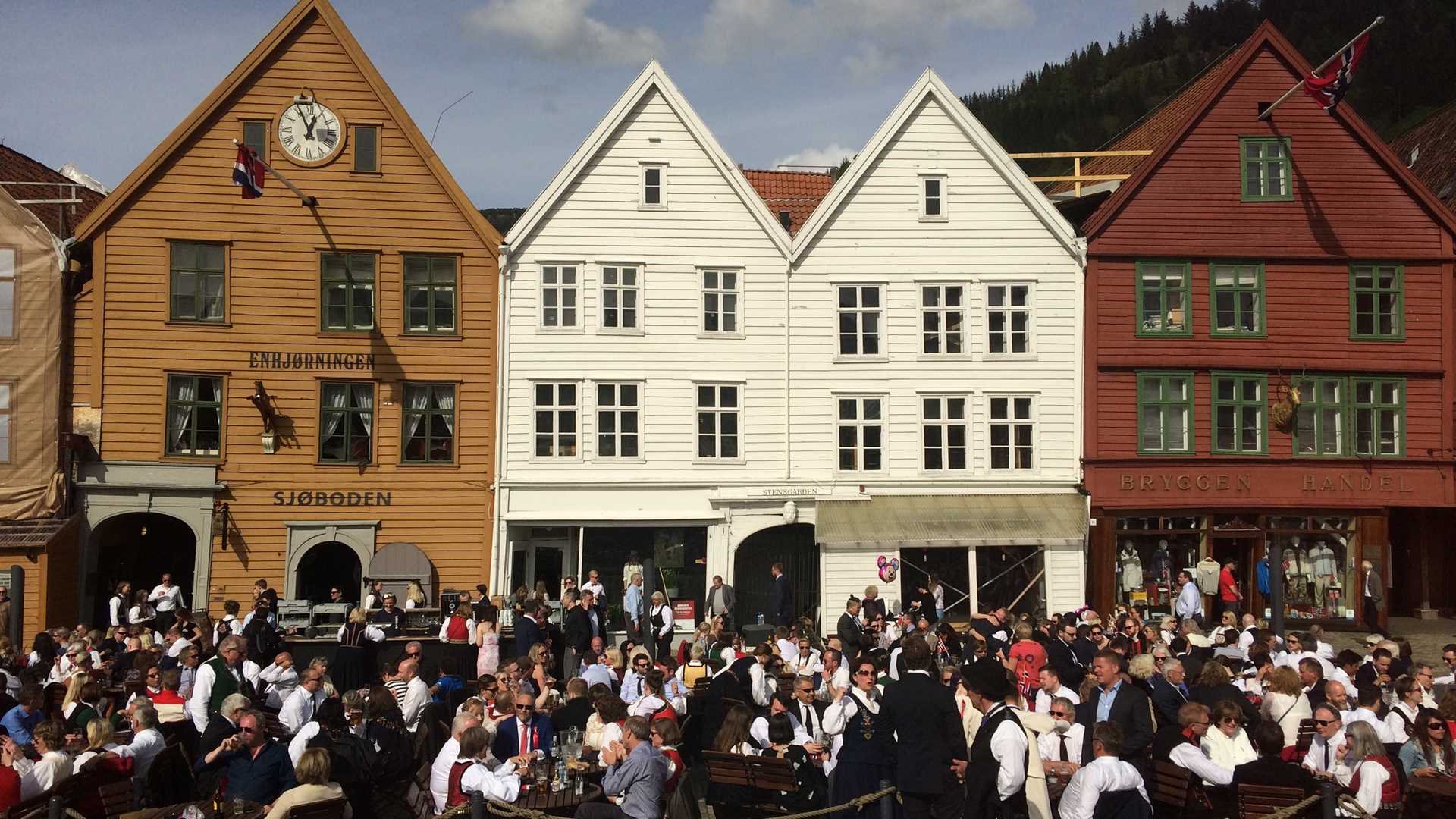If one could choose any day to be in Bergen, it would surely be today – May 17 – Norway’s National Day. Celebrating its status as an independent country from Denmark and then from Sweden, the population, men, women, children, were all out on the streets in their national costume, the women gaily attired in their long black skirts, white aprons, ornate red bodices and traditional jewelry.