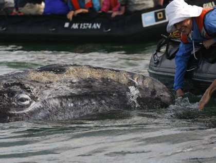 The Magdalena lagoon at Boca de la Soledad was flooded by a high tide this morning with the National Geographic Sea Bird gently rocking on it. Very early, guests, local pangueros, and staff boarded the expedition landing craft (ELC) to conduct the last whale watching rounds of the trip. Just in front of Boca de la Soledad we encountered several cow-calf pairs, some of which were friendly. They approached our boats and commenced intense interactions with us the humans, and a particular mother and calf rubbed their bodies against every ELC. This experience kept on unexpectedly at a high level because the calf was extremely playful and let us touch his skin, tongue, and baleen for long periods of time (maybe there were minutes, but for all us seemed eternities of joy!). Many times this calf exposed the large head out of the water, allowing us to even examine the barnacles and whale “lice” attached to the soft, cushioned skin. So close, so clear, so direct, so good, and so exciting! An unforgettable experience that maybe changed our lives and ways of conceiving nature without noticing it! The morning went like this — plus other sights of more cows and calves breeching or spy-hoping!