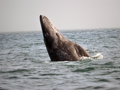 We awoke on National Geographic Sea Bird to discover fine misty dew lightly covering our decks. This fog covering is important to the dry desert climate around us, providing a fresh water source for the plants and animals of the otherwise barren sandy land. Our morning started early at 6:30 a.m. as we stretched, ate breakfast, and prepared for our visit into the gray whale inhabited waters. The cruises started in the rolling fog venturing out in all directions with wonderful local guides. In order to prevent disorientation, each ELC (expedition landing craft) was equipped with a GPS unit. The gray whale mothers and babies joined us as they swam, played, and continued their morning rituals, while we admired from the comfort of our ELCs. They did not disappoint with grand displays of breaching, spy-hopping, and rolling in the water. There was one especially exuberant baby whale that breached over and over, repeating the movement to our awe and amazement. In the distance, a few mature females were inspired, or perhaps instructing the youngsters, and also breeched with strength and grace. It was a most excellent sight for all out and involved in viewing the behaviors of these giants of the ocean. The next ELC groups had great opportunities to touch the whales and play with them for the rest of the morning. It could not have been more glorious.