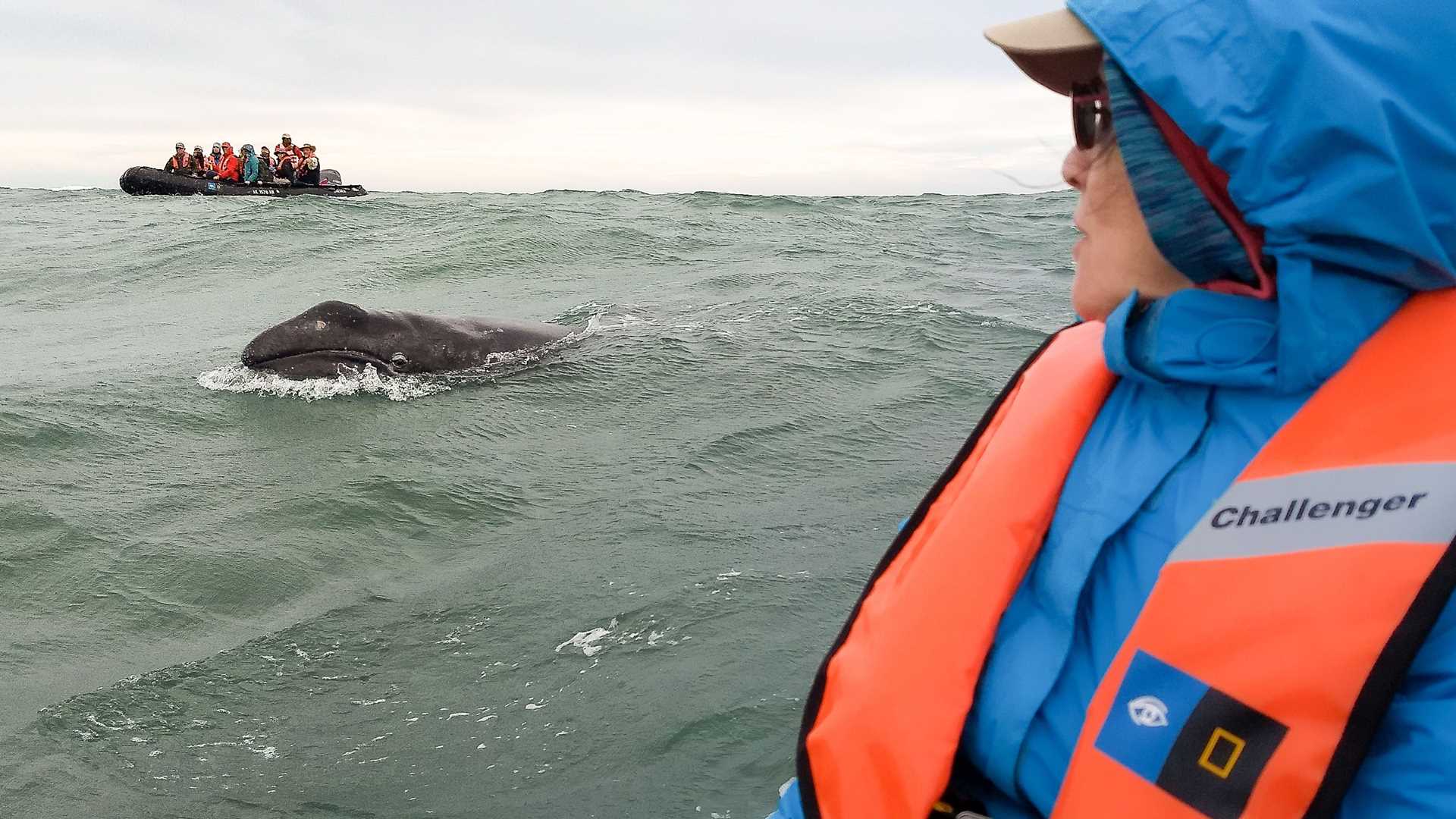 After we had a fantastic lunch of fresh greens and bowls of hot pozole—a local soup made from a delicious combination of sweet tomatoes, spicy peppers, and sour lime juice flavors—we loaded into the expedition landing crafts to visit the sand dunes and have our first chance to observe the gray whales up close. The weather changed throughout the day, shifting the afternoon to more wind, so traveling across water became an adventure as the hours passed. We broke into small groups, branching out in small boats across the bay in search of whales. Light sea spray misting our faces became large waves of sea water lifting our boats and raising us to see whales both near and far off in the bay. Poof, poof, poof. We could hear whales behind us, in front, see the blows, hear the breaths. It was impossible to glimpse every whale around us—there were simply too many. Salty waves crashed over the sides of our boats as we observed spy-hopping, breaching, and rolling whales at the surface.