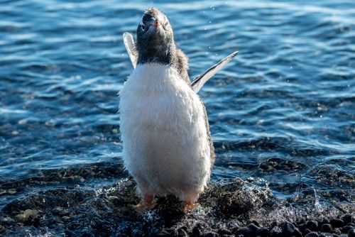 Today was yet again a fabulous Antarctic day marked by stunning blue-sky weather, plenty of penguins, and an exciting range of marine life. After breakfast, we zipped to shore at Brown Bluff, a fascinating geologic area where we found hundreds of penguins. This is a colony which supported 100,000 pairs of Adelie penguins earlier in the season, but is now reaching the season's end. There were a handful of Adelie chicks and many gentoo chicks testing the waters and exercising their wings. The beach shallows were kiddy pools filled with fluffy chicks sticking their heads into the water, wading in, and being pushed around by small incoming waves. We enjoyed watching their antics for a couple of hours, as well as finding a solitary fur seal, and taking a hike onto the edge of a glacier.