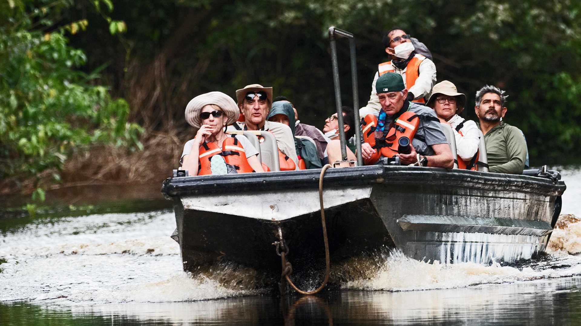In the early afternoon, we kayaked around Nauta Caño. Conditions were ideal. The sky was a bit overcast, but the water was calm, and many birds flew around us. After kayaking, we went on a skiff ride along the river. We spotted several birds of prey at close range from the skiffs. Almost at sunset, we spotted a monk saki monkey perched in a high branch at the top of a tall tree.