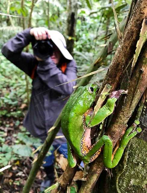 After breakfast, we tried our boots on and went ashore at Casual to hike a trail that the local people have been maintaining and protecting. Located on the northern shore of the Marañón River, opposite to the Pacaya-Samiria Nature Reserve, Casual is a wonderful place of slightly elevated land that never gets flooded during the high water season. It was a great introduction to the tropical rainforest and a few men from the village nearby helped us finding some creatures. That way we had the amazing opportunity to meet some truly fantastic animals up-close and personal. We saw several poison-arrow frogs, a much larger arboreal monkey frog which was a most spectacular subject (made us photographers drool with excitement!), and a 9 ft long green anaconda and a smaller red-tailed boa reminded us of tall tales from early explorers about huge snakes. Of course, no early explorer's account from centuries past was complete without a tarantula and we were no exception; many of us had the pleasure to admire and photograph an impressive-looking and attractive red-knee tarantula that even took a stroll on a few guests' arms.