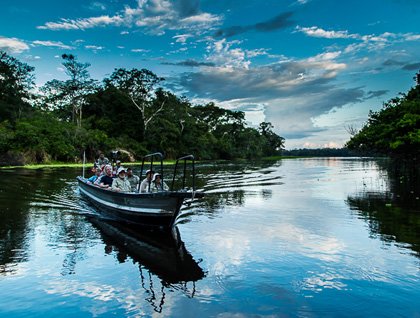 Later in the afternoon, we got the skiff ready for another outing, this time in the search of gray and pink fresh water dolphins. On the way to the lagoon, we enjoyed amazing views of the jungle, and of the birds that our naturalist were able to spot for us. Once we reached the dolphins’ habitat, it was only a matter of minutes before these unique creatures started to show up, drawing a big smile on everybody’s face. Finally it was time to head back to our ship, enjoying a spectacular sunset to end our first day of our expedition.