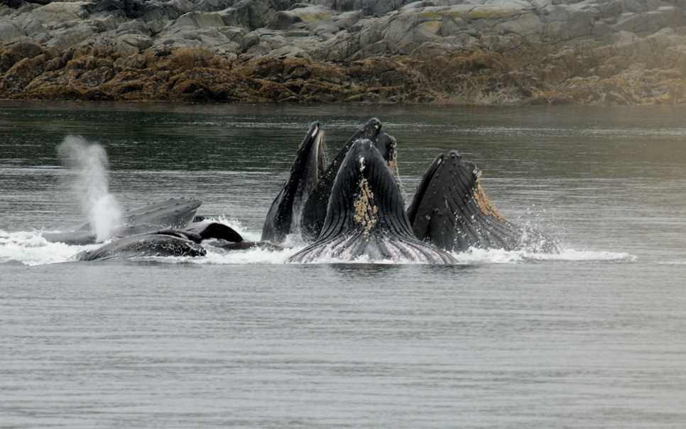 The call came early this morning, well before breakfast, that cooperative humpback whale bubble net feeding was observed form the bridge. This animal behavior is unique and quite extraordinary. It is only seen here in Southeast Alaska. As the humpback whales make their way from the breeding grounds of Hawaii to the feeding grounds of Alaska an interesting phenomena occurs. The whales, both males and females but unrelated come together as a group, sometimes a small number of 4-5; other groups are quite large with more than 15 animals involved. These groups get together and using specific tools corral herring and other prey to the surface of the water where they are devoured by the huge mass of marine mammals. Using their flukes to move the fish, their voices to further scare the prey and bubbles to hem them in, the whales create a huge aggregation of fish. We were witness to this cooperative feeding again and again as the whales went through their paces. The conditions were ideal as the seas were calm enough to see the bubbles at the surface which would show where the whales would appear.