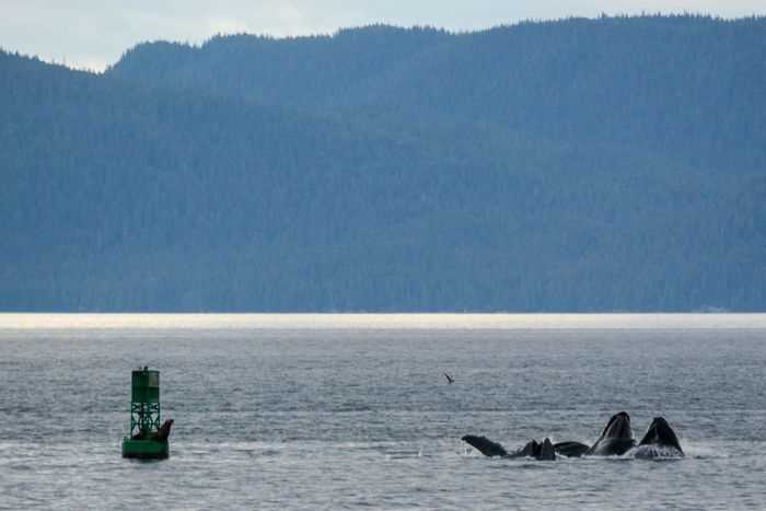 This morning, we woke up near the entrance to Peril Strait with a group of 12 north Pacific humpback whales cooperatively bubble net feeding near shore. This hunting strategy is used to corral herring – a small, schooling bait fish – using air, loud noises, and flashes of bright white color to scare them into a tighter ball. Herring are extremely sound-sensitive, so the loud vocalizations from one whale in combination with the curtain of air is extremely disorienting. Pair these with a barrage of 15-foot-long pectoral flippers flipping and flashing their white undersides outside the bubble net, the corralled herring don’t stand a chance. We enjoyed watching this repetitive cooperative feeding for about half an hour until it was time for we ourselves to have breakfast.