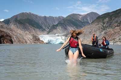 In the early morning, National Geographic Sea Bird cruised through Tracy Arm, picking her way through the ice falling off Sawyer and South Sawyer glaciers until reaching Sawyer Island shortly after breakfast. A sunny day awaited as expedition landing crafts took off, heading toward South Sawyer Glacier. Harbor seals watched from the water as the small boats explored the area, taking in views of the glacier as well as the perfect reflections of mountains in the calm water. Looking up, instead of clouds we spotted goats balancing on the mountains, enjoying the vegetation that worked so hard to gain a foothold on the rock. After a chance to warm up from the katabatic winds over lunch, a few brave souls earned another hot chocolate when they jumped into the water in front of Sawyer Glacier while the cheers of onlookers on the bow matched the sound of the calving glacier.