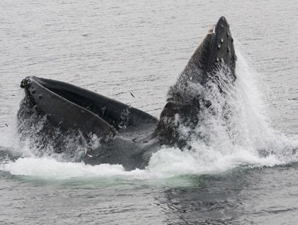 The weather continued to improve, becoming downright warm, as the ceiling overhead lifted, and the threat of rain seemed to vanish right before our eyes! The decision was made to give another photo presentation, and as usual, it worked like a charm. About halfway through it, the expedition leader walked into the lounge and announced that there was a lunge-feeding humpback whale ahead; lecture over!