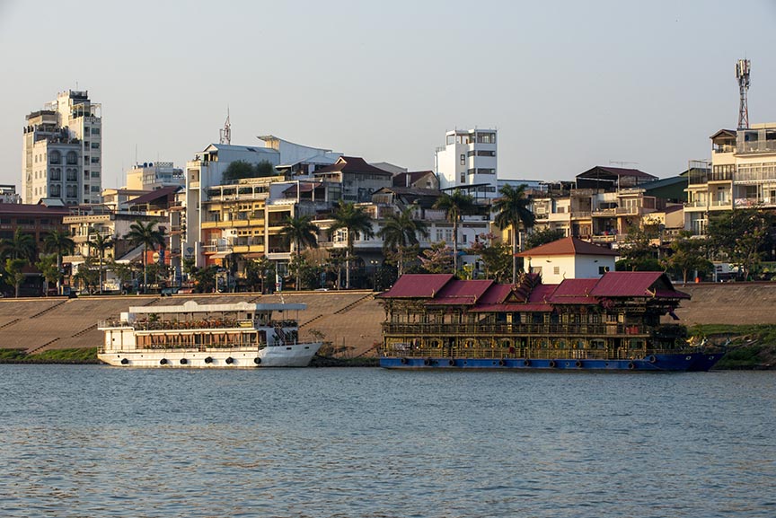 On our final full day on board the riverboat Jahan , we cruised further south on the Mekong where we could see changes in the number of other boats as general river traffic increased. The river here was also tidal and we could see mangroves start to appear in places along the banks. After breakfast we embarked onto local longboats for our transfer to the nearby island of Binh Thanh. One of many islands within the Mekong Delta which is criss-crossed by many canals and rivers. Along the way to the island we passed many small fish farms that are directly within the river, these rafts of floating houses with arrayed ponds raise tilapia and basa (a type of catfish). All along the narrow waterways, we also passed large floating mats of water hyacinth forming dense impenetrable barriers in places. On arrival at our dock our longboat paused to make way for the local ferry transporting a number of locals on motorcycles across to the mainland for their early morning commute to work. Our visit to this small community involved a stroll through the streets to a local temple that also serves as a local community centre. We had the opportunity to meet with one of the elders and understand how Vietnam has grown in recent decades and how they embrace peace and welcome American tourism to their country. We also had the opportunity to see how woven mats were weaved and how dried water hyacinth can be used to weave baskets. In the afternoon we visited another village via longboat to see how puffed rice, sugar palm treats, and rice wine were created. In the evening on board Jahan , over a farewell cocktail party we shared our appreciation to the wonderful crew and later enjoyed the voyage slideshow in the lounge.