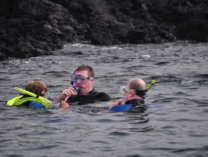 Back onboard and suited for snorkeling we went to one side of Santiago Island and saw many impressive underwater creatures, like the white-tipped reef sharks, penguins, rays, turtles, and fish of all kinds.