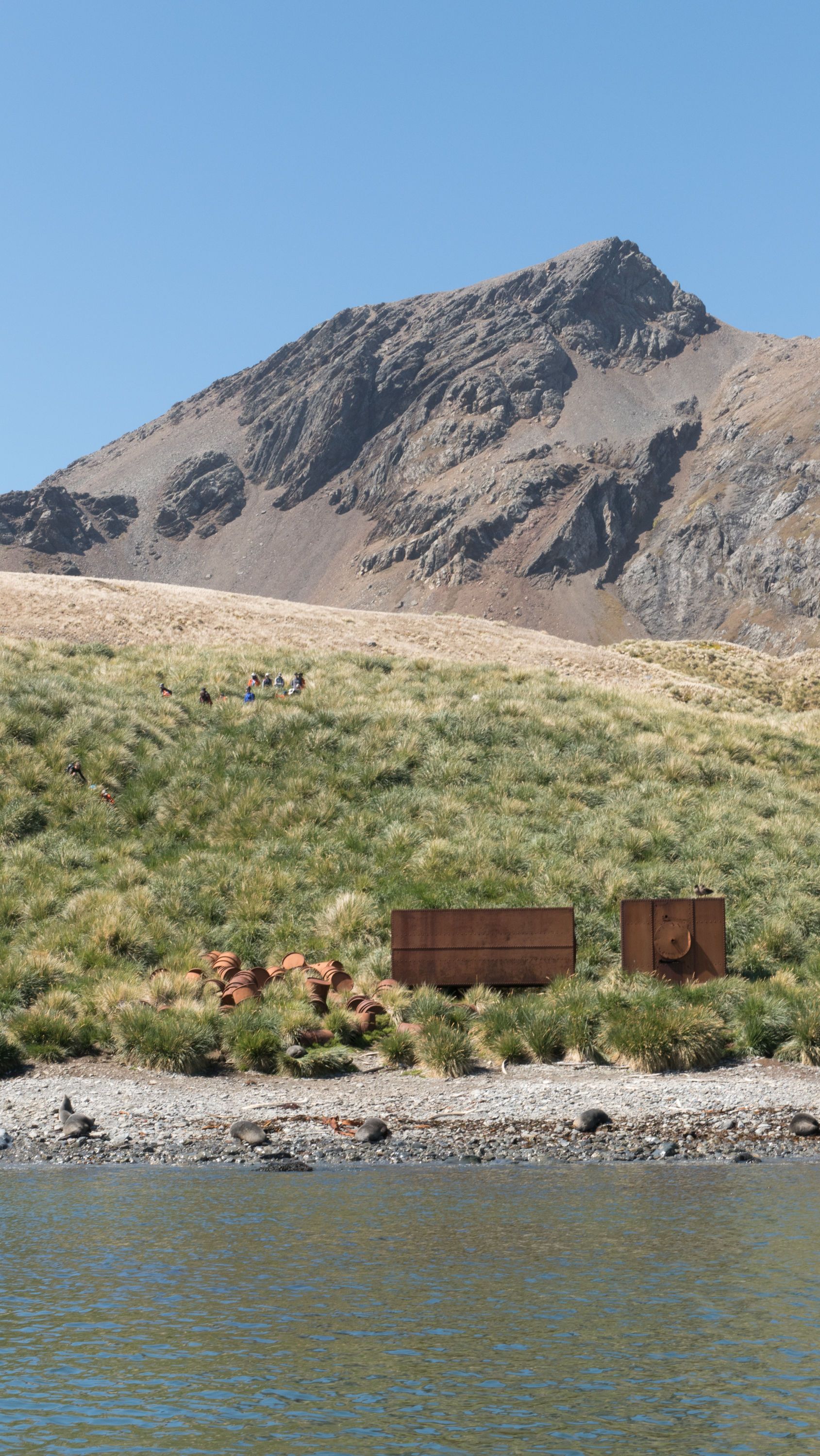 Speaking of tension, you can feel it rising as the Zodiac hits the shoreline and the first thing we see is a gauntlet of staff making a safe path for us between competing male fur seals. We discover South Georgia Island is going to make us earn our prize as we climb up a short but steep hill to the top of the ridge. There we make our way through the tussock grass, growing on tuffs of soil. Ever watchful for a resting fur seal, or a nesting penguin, we make our way to the main penguin colony.
