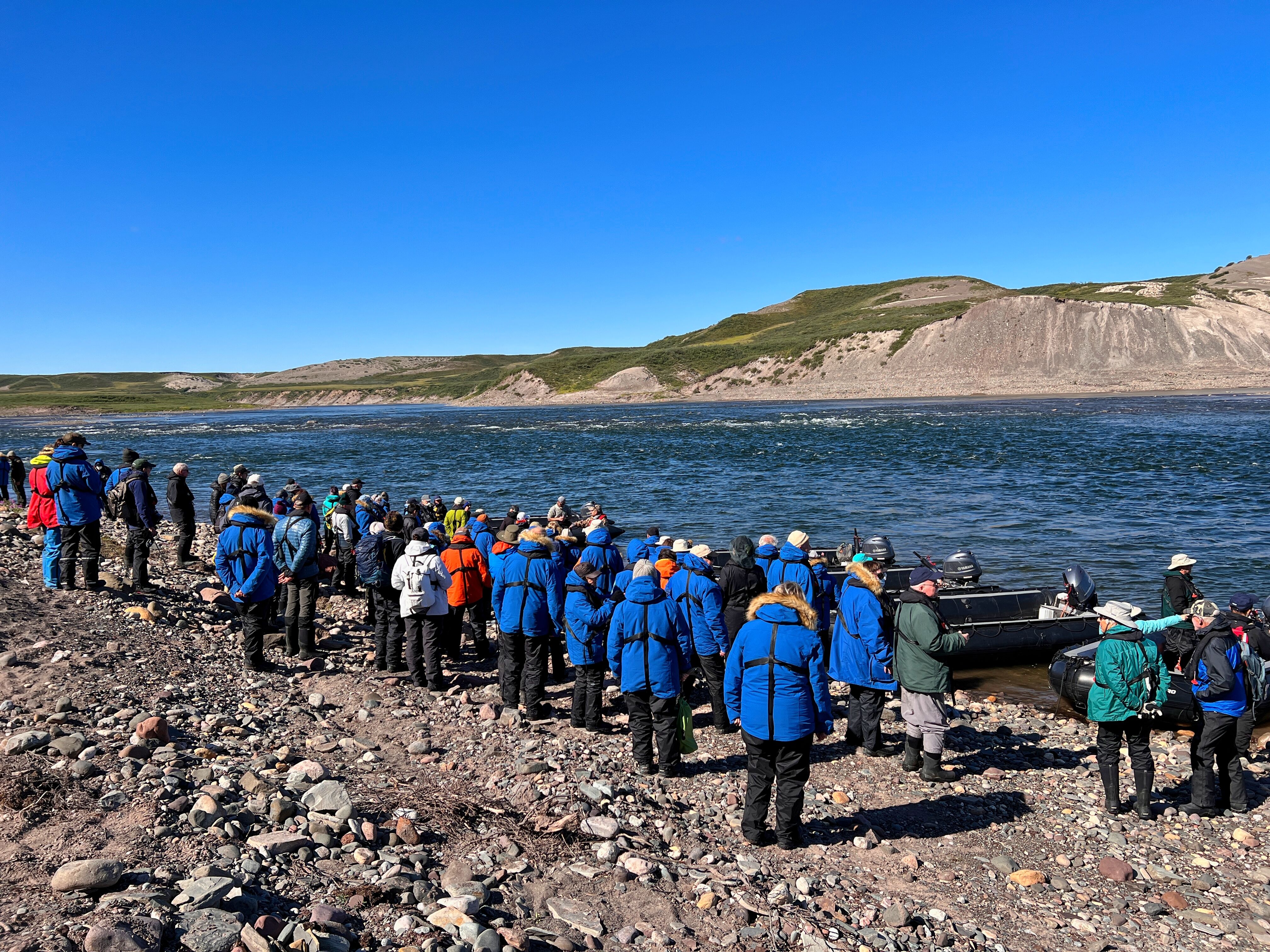 We dedicated the morning to hiking ashore, and almost every guest took advantage of the calm and sunny conditions to hike across the tundra and along a road (a rare sight!) that goes up to a small airstrip on top of a ridge. From the high points, we could see several lakes, and a few of us were lucky enough to spot plovers, ducks, and even cranes. One group also saw an arctic hare dashing across the tundra.