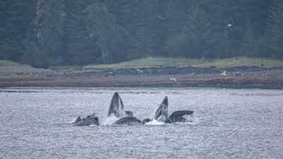 National Geographic Quest arose amidst light clouds within the protected waters of Ushk Bay. This area is known for a salmon stream and yields plenty of opportunity for kayaking and exploring the vast meadows of its inner waterways. On this day’s occasion, guests were able to hike and paddle their way along the coast of Ushk Bay and witness firsthand the life cycle of Pacific salmon making their way upstream. As we transited through Peril Strait, we were lucky to see humpback whales. These immense mammals were “lunge feeding” very near our ship. Being able to witness this event was unique for guests and staff. Lunge feeding is process through which individual whales push their gaping mouths through the surface and collect any fish or planktonic invertebrates in the process. Witnessing this behavior was truly a remarkable experience for all. We will cherish this moment for a lifetime.
