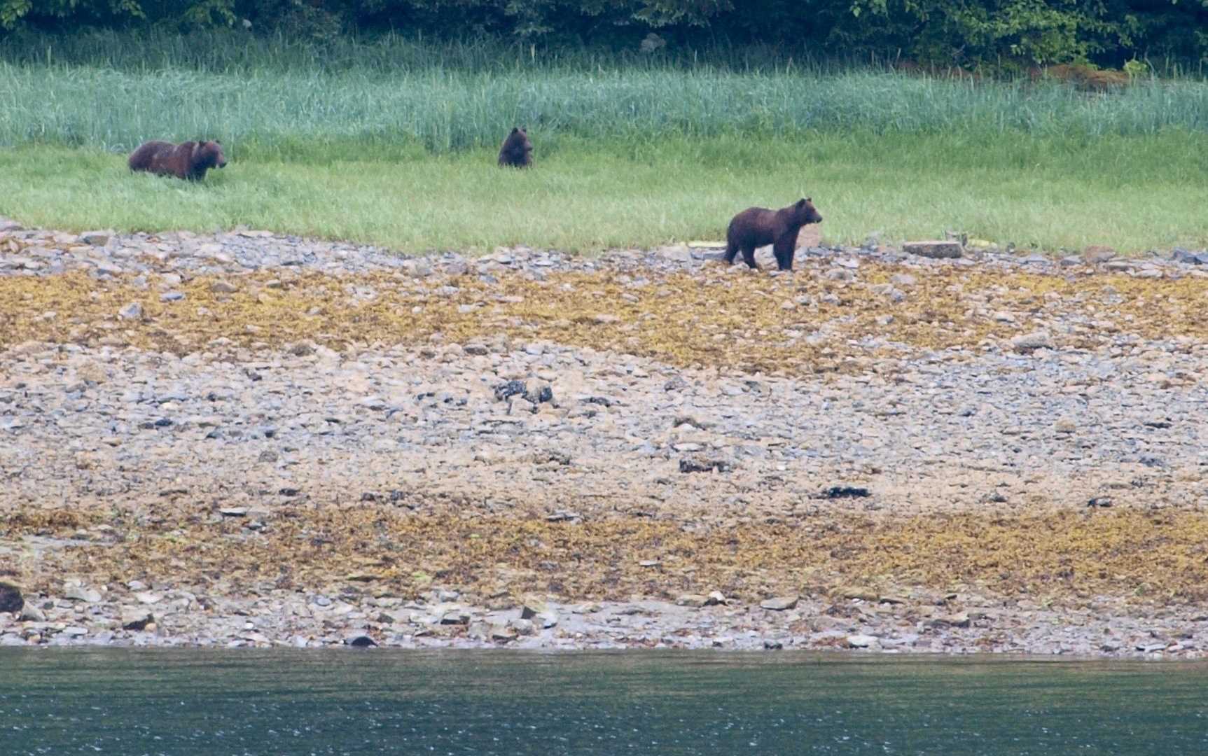 Some days start out as a real bear, but, wow, today turned out to be an especially bearish. After cruising overnight from Sitka through narrow passages between islands in southeast Alaska with a number of Sitka Deer along the shorelines, we found ourselves in the early morning exploring the inner recesses of Sitkoh Bay. We first found a mother brown bear with two yearlings. They were ambling along the shore and grazing on the beach rye above the high tide line. Aware but unconcerned with our presence offshore, they went about their own important business as we quietly watched nearby. Soon another lone bear was seen further down the beach, and even another far in on the grassy plain at the head of the bay.