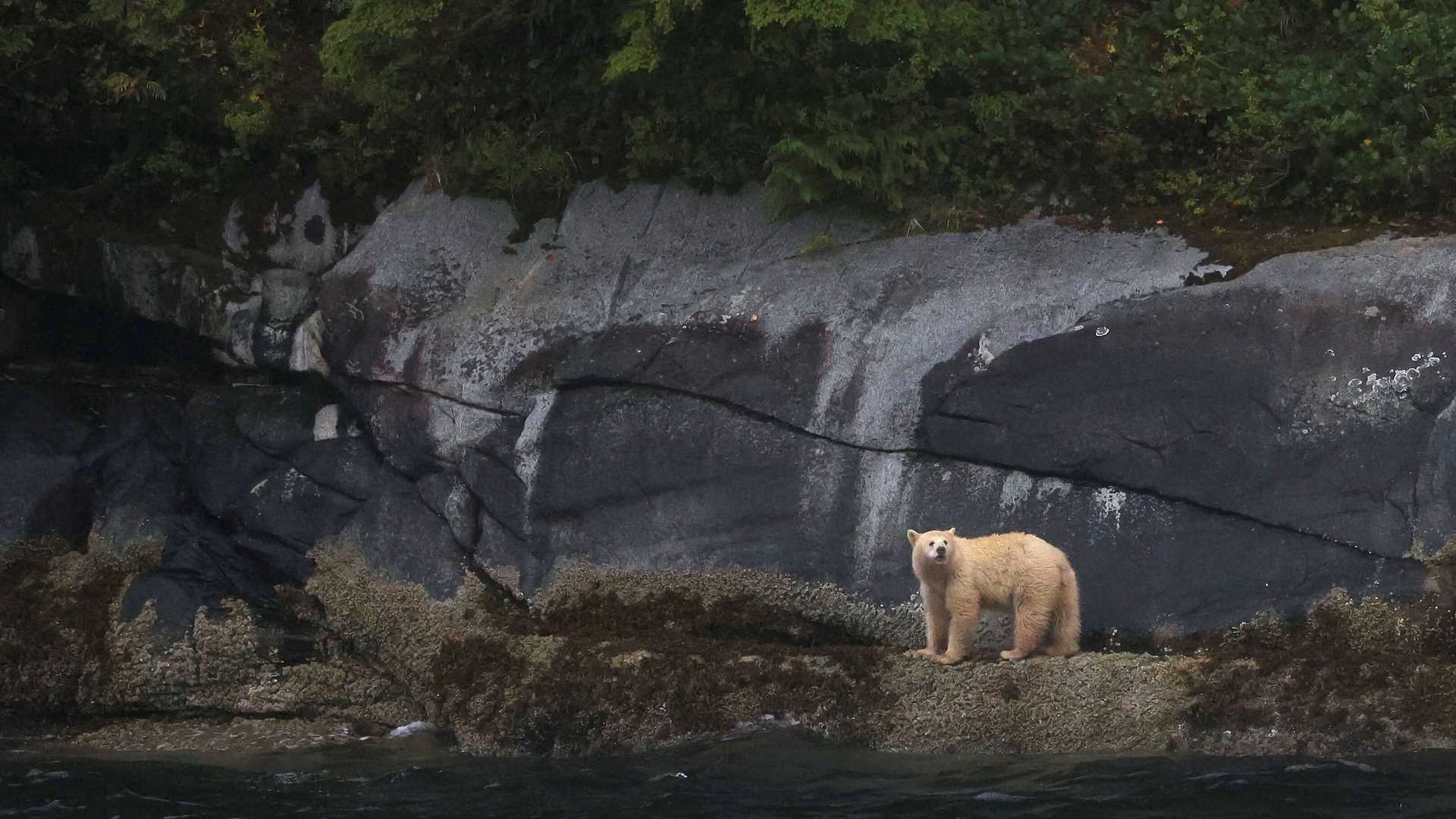 When timing is in your favor, magical moments take place. The docile tone from Expedition Leader John Mitchell greeted us with the morning announcement as we found ourselves sitting off Hartley Bay, British Columbia. A logistical fuel stop that was needed this morning for our fleet of Zodiacs set the pace for what turned out to be a perfectly timed wildlife extravaganza on both water and land. You see, the fuel dock station normally opens at 8:00 a.m. Today, they started their morning a little late and didn’t open until 8:30 a.m. Our ship’s boatswain returned to the ship from the fuel stop around 9:30 a.m., and the deck team immediately raised the Zodiac so we could make our way towards Prince Royal Island in search of wildlife. National Geographic representative Lauren Eckert was in the lounge giving her presentation, “Welcome to the Great Bear Rainforest: The Land of the Spirit Bear & So Much More.” Almost immediately, our team of naturalists on the bow spotted a group of killer whales! The bridge team positioned the ship for a closer look, and it was then that we noticed a lot of splashing and surface activity taking place. A Dall’s porpoise in the mix with killer whales! Were we witnessing an active hunt? As time progressed, there was no sign of the Dall’s porpoise anymore, and the activity of the killer whales quieted. We made our turn towards Prince Royal Channel only to be stopped by humpback whales! We stopped for a bit to curiously watch these beautiful animals as they displayed their flukes just off the bow. The winds started to increase, and the rain became steady as we continued making our way towards Prince Royal Channel. The fuel stop and observations of killer and humpback whales delayed our arrival towards Prince Royal Island and our search for the Kermode “Spirit” Bear. It was as if these “delays” placed before us were to slow us down for what happened next. We continued cruising south along Prince Royal Island. We scanned the shoreline when suddenly an announcement came over the ship’s internal public address speaker: “Good afternoon to those aboard National Geographic Venture. We have spotted a Spirit Bear along the shore.” The persistent rain and winds did not stop the bow from filling up with excited guests, crew, and staff. The bear acknowledged us and went back to eating barnacles, bivalves, and berries along the shoreline and the forest edge. At one point, the bear meandered up a rock face and into the tree line before peeking its head out for a look at us below. We quietly floated for almost an hour as we witnessed this beautiful animal in its environment. What a magical moment for all!