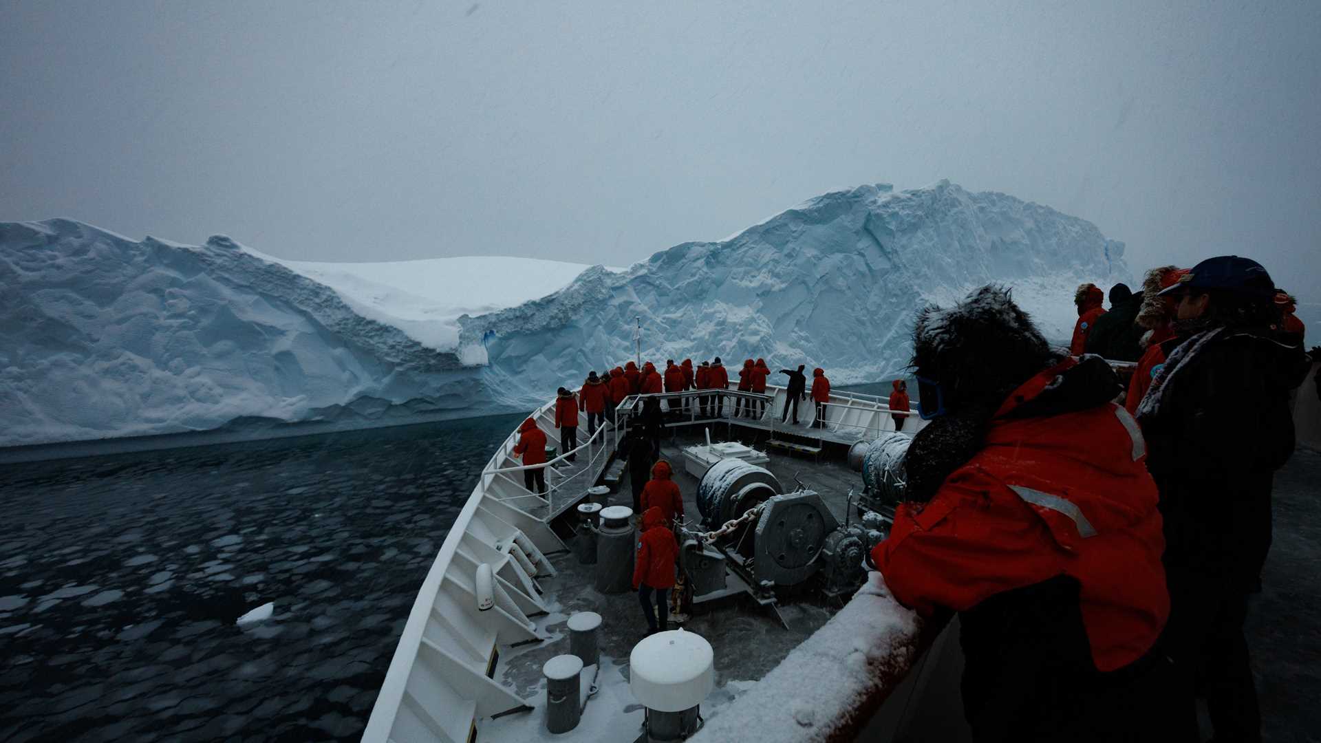 We have reached Antarctica! Today onboard National Geographic Explorer, we finished our crossing of the Drake Passage and made it to Dallmann Bay. Our Captain Peik Aalto welcomed us with a traditional Captain’s Cocktail Party. By the time we were seated for dinner, icebergs were gently gliding by the windows. After dinner, the ship cruised into the smaller Fournier Bay. We took to the decks amongst softly falling snow to get close views of icebergs and to peer at mountains through the fog. We have made it, and it is beautiful.