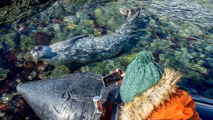 We are surrounded by rocky islands that are permanently covered by ice cliffs. Some surprises wait for us around each corner of the islands. A few chinstrap penguins here, there some Antarctic fur seals, a leopard seal on an ice floe, some shags and gulls nesting, some Weddell seals hauling out. We arrive back aboard late for our recap, one ultimately interrupted because of humpback whale breaching and orcas spotted from the bridge!