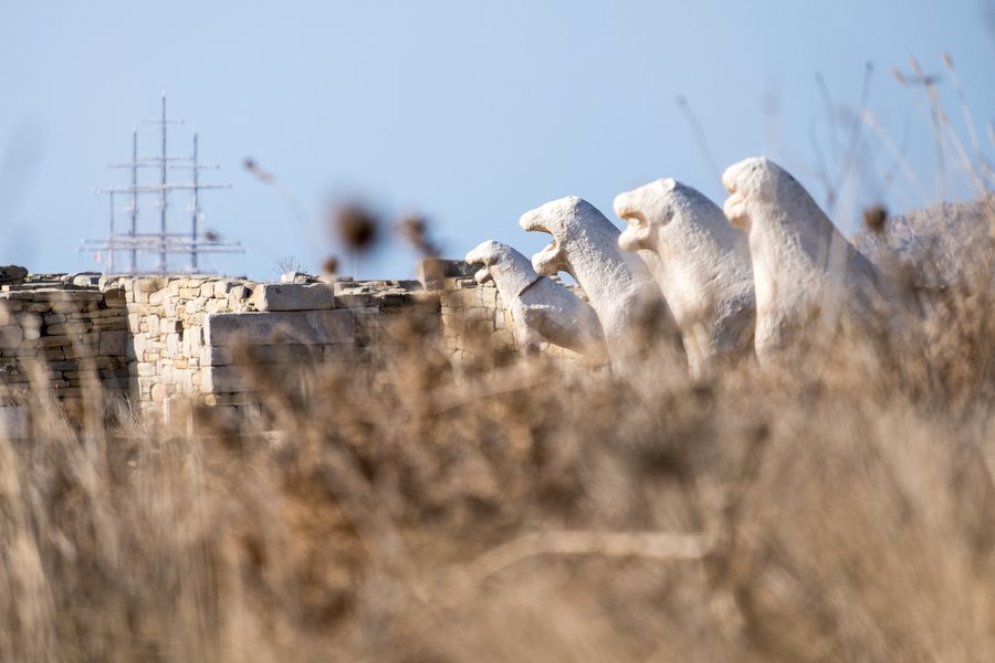 This morning we started bright and early by visiting the centre of the Cycladic world, the island of Delos, an entire island of ruins where no one else but the archaeologists and guards live. In mythology Delos is the birthplace of the two glorious, eternally young twins, Apollo, the god of light and civilization, and Artemis, the goddess of hunting. Only this ‘fact’ was enough to make it the centre of an imaginary circle (cyclos) of islands, a group of islands in the south of the Aegean Seastill called Cyclades. We found this isolated wind-blown island empty and all to ourselves (until the large noisy crowds arrived later from the party island of Mykonos) and enjoyed a nice travel in time. We visited the sanctuary and went 28 centuries back, when this became the place where the Greek Ionian islanders worshiped the divine twins. We saw their temples, the remains of a vast marble ancient statue of youthful naked Apollo (only the base weights 32 tons!), the Lions’ Terrace and the Sacred Hoop-Lagoon where the twins were born. We also visited the ancient theatre and a few of the luxurious houses with inside lavish courtyards laid withmosaics, in a city of parvenu merchants, ship owners and seafarers of thirty thousand people that developed around the sanctuary back in the 2nd century B.C.! As we walked up the ancient streets with their extensive sewage system, some actually said that it felt as if they were walking in Pompeii (minus the frescoes), only this was two centuries earlier! Quiet a few of our adventurous members made it up to the steep hill with the temple of Isis and Mt. Kynthos and enjoyed a glorious birds-eye view of the entire region!