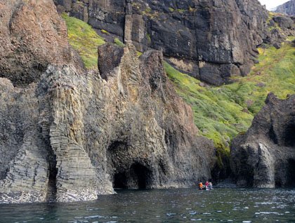 For most of our trip in the Canadian Arctic and Greenland, geology (despite the exhortations of Jason Kelley) and vegetation have taken a back seat to wildlife and ice—surely to be admired but an opening act to the polar bears, glaciers, and icebergs that have defined our experience. For most of our trip, we have travelled through almost unimaginably old rocks, laid down in seas far away from our (and their) present location, and often (as yesterday) altered by forces of heat and pressure. We have passed through some of the oldest rocks on Earth, their age measured in billions of years, time that we can scarcely comprehend. Today, more recent geology came to the fore. We have reached Disko Island, the largest island after Greenland, itself. Our activities here were on the water by kayaq (the Greenlandic spelling) or Zodiac. Disko Island was formed as the land that is now Greenland passed over a geological hotspot a mere 60 or so million years ago and not too far from its present location as a part of North America. Molten material (magma) from the Earth's mantle rose up to the surface and cooled to form igneous rock—basalt, but here a special form of basalt. As the material cooled and contracted, it separated into distinct columns of regular size and geometric shape forming mostly pentagonal and hexagonal columns packed regularly together, here seen sheared off in cross section, there packed like, well, cigars in a box. Columnar basalt is found in various spots around the Earth, but here was a most magnificent display of it, eroded by time and the sea into weird and wonderful shapes.