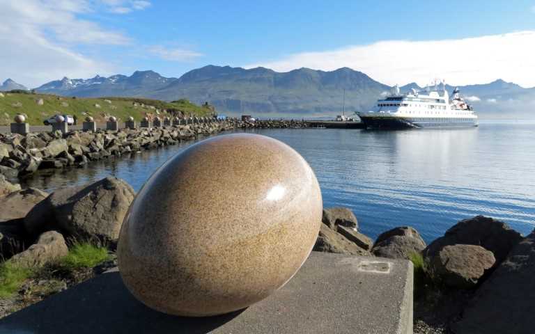 We sailed overnight across the North Atlantic from the remote Faroe Islands to East Iceland. At breakfast-time the National Geographic Orion docked at Djúpivogur, “Deep Harbor”, in East Iceland. Here the bold, ice-carved mountains rise steeply from the sea and everything we see has been shaped by glaciers during the Ice Age. Stacks of layered basaltic lava flows, all shaped by ice, dominate the dramatic landscape along the coast.