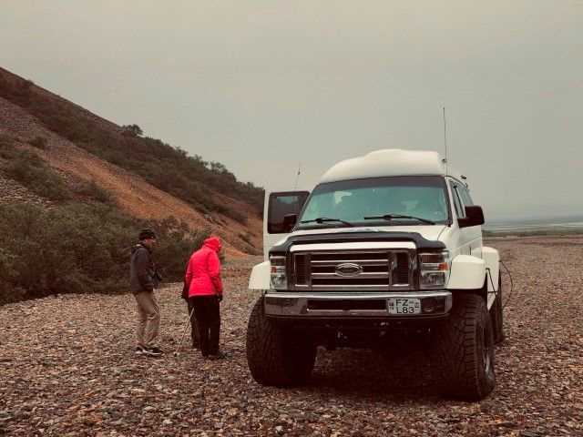 East Iceland is usually quite sunny while Reykjavik is usually quite cloudy, but today it was the other way around. Djupivogur welcomed us with very dense fog, which made the landscape all the more mysterious. We got in the 4x4s—monstrous trucks modified with huge tires that are deflated before crossing rivers or driving on snow. These trucks took us to remote highland areas of dramatic canyons and glacial rivers.