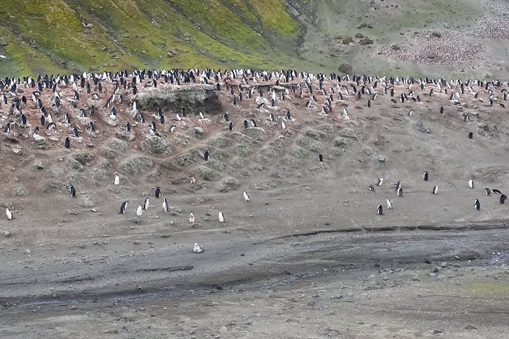 This day was like a cherry on the top of a cake for the entire expedition. In the morning, our ship approached Deception Island, which has one of two active volcanoes in Antarctica. In fact, the entire island represents leftovers of a gigantic volcano that violently erupted about 10,000 years ago creating an underwater caldera (a blast hole) in the central part of the volcano. So, the island represents a rim of land around the caldera bay and resembles a horseshoe in outline. We had to land outside of the caldera bay on the tops of large swale waves. Thousands and thousands of busy chinstrap penguins greeted us both during our approach to the landing and on land, where dramatic wind-carved sculptures sat on an impressive cliff made of countless volcanic ash layers. We hiked for about 1.5 kilometers maneuvering among nesting sites of penguins. Around 50,000 chinstrap penguins nest in this area. Many curious penguins came directly to our feet and had their portraits recorded on numerous cameras. Chicks were still very young and had gray baby plumage. From time to time, we saw brown skuas and giant petrels among penguin colonies. These birds of prey were looking for lunch. Geology of the site was as impressive as the bird life. Despite the island’s short geological history (this volcano and the island appeared only 1.5 million years ago), we saw plenty of evidence of geological events. An Ice Age glacier completely buried the island under a thick layer of ice and as it moved, it bulldozed volcanic deposits leaving very smooth hills behind and depositing new hills of morainic material. After the thick continental glacier melted, small valley glaciers kept doing their job of “eating” mountain slopes and creating cliffs along the directions of their movement. New eruptions covered the results of the glaciers’ work with new layers of volcanic ashes sprinkled with volcanic debris. The wind helped create this dramatic landscape, blowing black sand and dust around and depositing black dunes. Finally, penguin activity created a dense network of eroded trails that over thousands of years added their own contribution to the landscape relief. After everyone was back aboard, the captain sailed our ship into the caldera bay. Over there, we could see remains of a whaling station from the beginning of the 20th century and remains of scientific stations abandoned after the eruption of 1970. Along the shoreline, we could see areas with steam coming up, indicating that the volcano is just having a nap but not yet sleeping. The rest of the day National Geographic Resolution was set on crossing the Drake as this was our last day in Antarctica. Goodbye, land of the sparkling ice! After dinner, guests enjoyed a crew show that featured many talented singers, musicians, and magicians.
