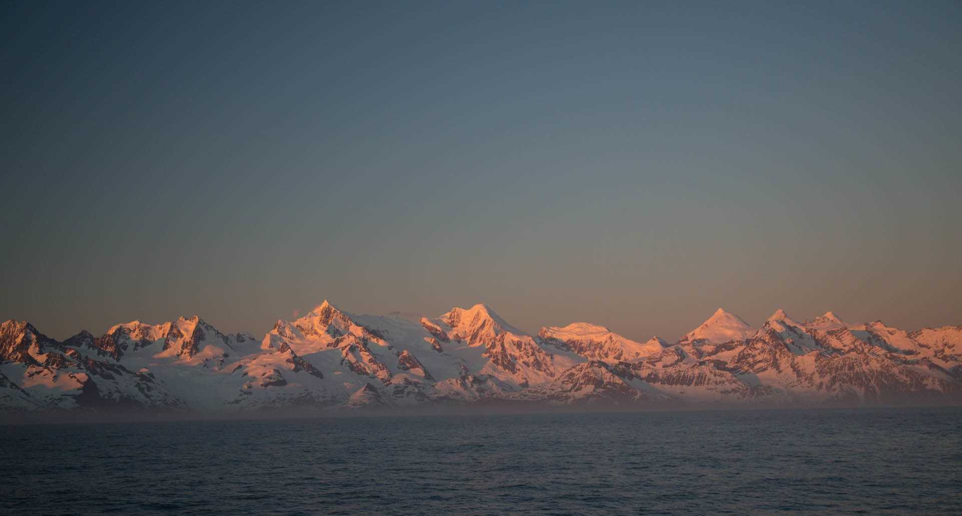 A fantastic sunrise on a clear sky illuminated the flabbergasting profile of the South Georgian mountains and glaciers. The entrance to Drygalski Fjord was dotted with ’bergs and birds, presenting a very Antarctic scene in this the southernmost part of the island.