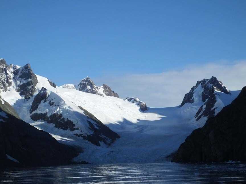 Soon after breakfast, on this bright, sunny day, we pulled out of the swell that was causing the National Geographic Explorer to roll a little and we entered the mouth of Drygalski Fjord on the far southeastern end of South Georgia. The fjord runs west northwest for about two miles and is bordered by spectacular steep-sided cliffs and tumbling glaciers. Looking up one glacial valley to the north, one could see the high peak of Mount Carse towering over us.