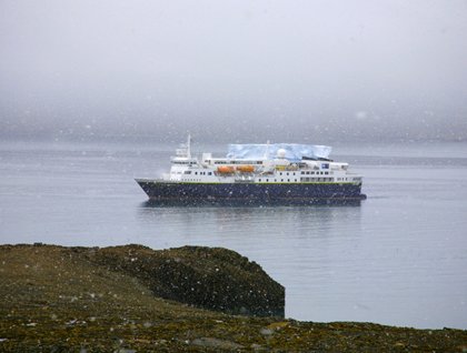 Early this morning the slate grey coloured sea was sliced by the dorsal fins of a small group of orcas. The bridge hummed with the excited, shared comments of guests and staff as we watched them moving through the water searching for food, at close quarters to the National Geographic Explorer. Breakfast was followed by a couple of presentations in the lounge as we progressed towards our planned afternoon landfall at Dundas Harbour located at the southeastern corner of Devon Island. Just before lunch it began to snow as we dropped anchor in a shallow, sheltered bay to the north.