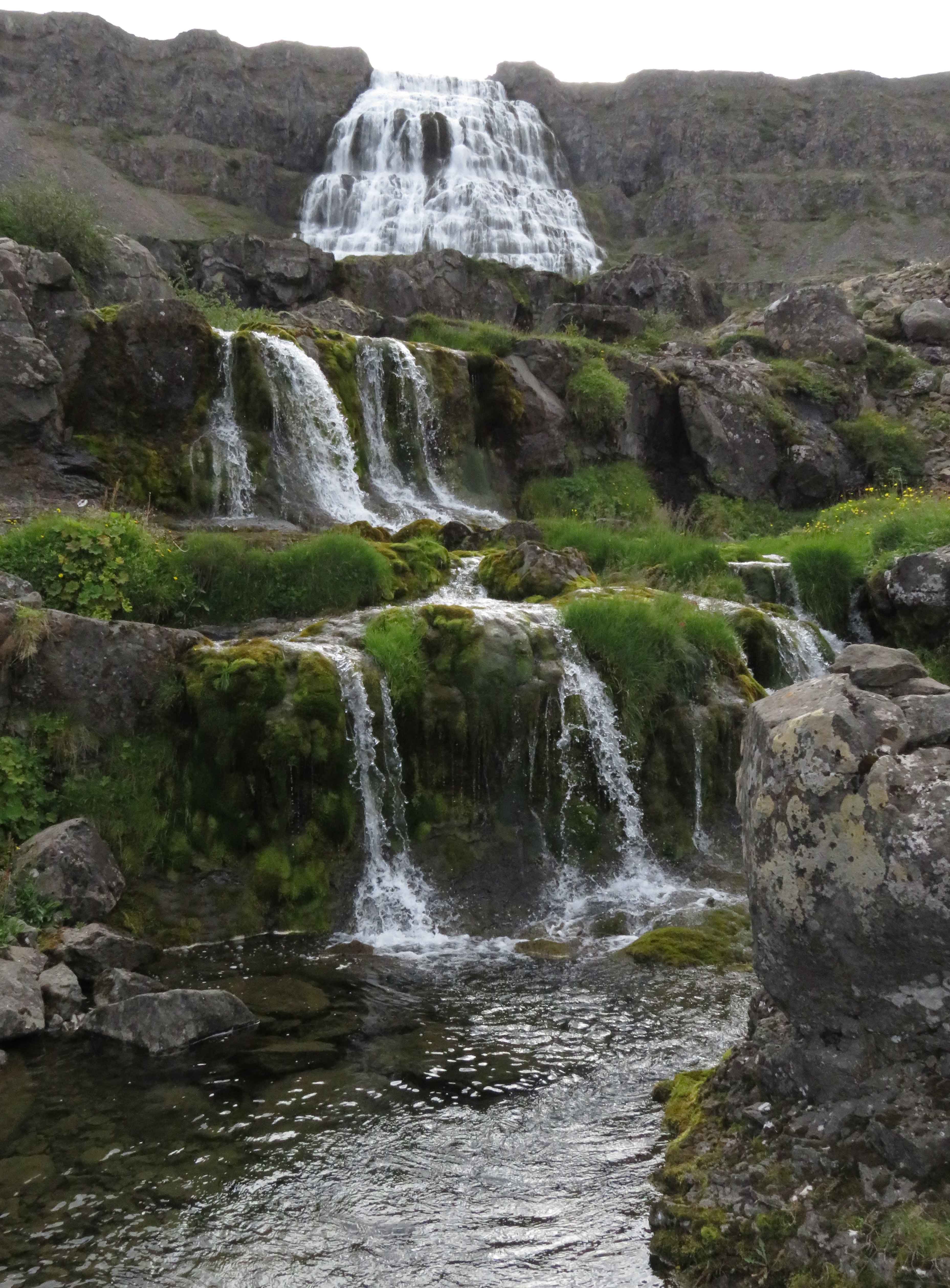 Hikers went ashore by Zodiac and begin their treks along the shore before beginning to climb the steep trail alongside the waterfalls—yes that is plural. Dynjandi is a series of seven waterfalls. The highest part of Dynjandi pours in a broad torrent over a high precipice. Fed by snowmelt and groundwater, this cascade then leaps roaring and splashing over a series of steps formed of lava flows, falling in total about 100 meters before flowing into the sea.