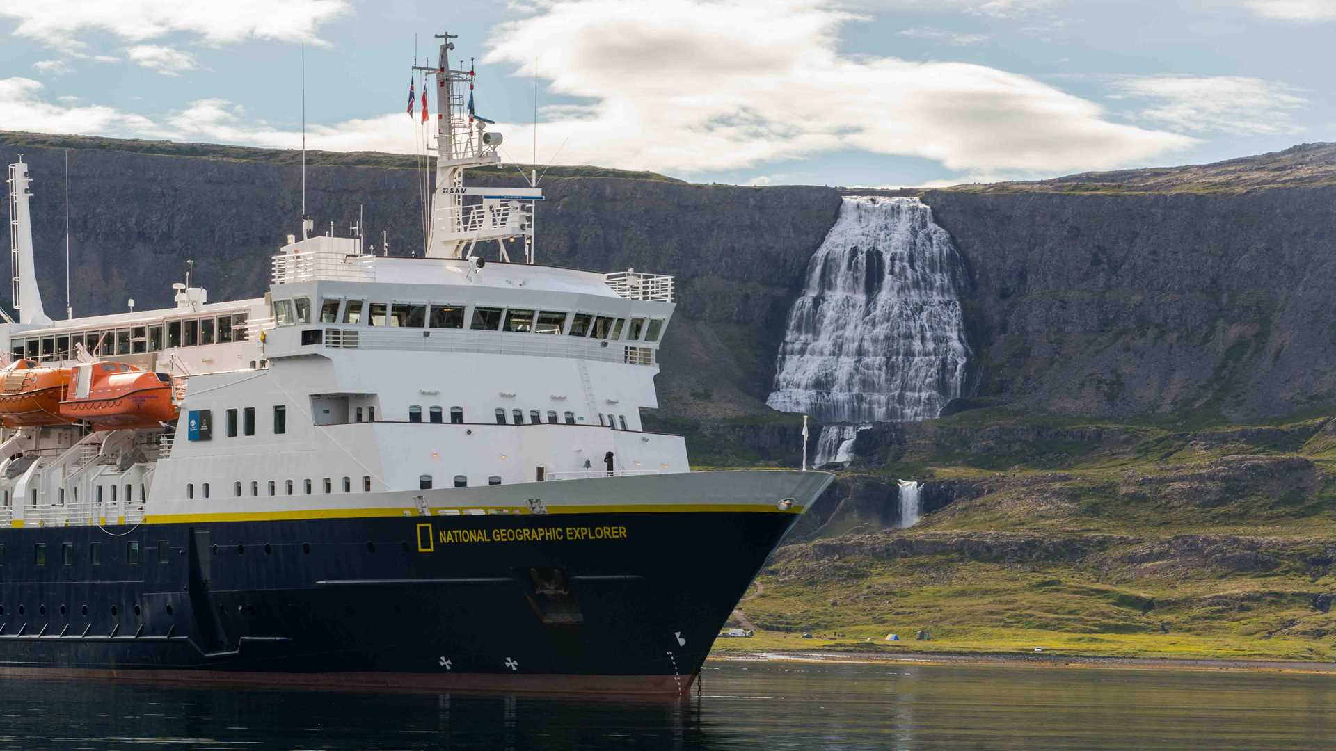 By 0600 National Geographic Explorer was at anchor in the north arm of Arnarfjöƌur and the majestic sight of Dynjandivogur was just off our bow. This spectacular waterfall, meaning “thunderous” spills from the basalt cliff in a wide swath of frothing meltwater necking down with each successive plunge over the basalt terraces left by the volcanic activity that formed this island making it arguably one of the most beautiful in all of Iceland. This morning we set out to hike up the trail alongside this marvel obtaining stunning views as each tier was reached, seven in total. To add to the already overwhelming scene we experienced idyllic weather conditions with hardly a breath of wind and mostly sunny skies. This prompted our expedition team to offer kayaking as an option to explore this remarkable setting. Paddlers could either hike first or later soak in the falls afar or vice-verse.