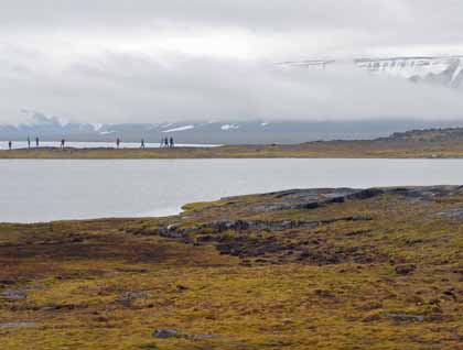Having seen more of a desert landscape the previous day, today’s tundra was rich with Arctic vegetation, and the soggy ground bulged and cracked with tiny streams and ponds breaking up the landscape. The spongy softness of the tundra is called the active layer, and holds its squishy texture due to the layer of permafrost directly beneath it. The ground below the active layer is hard and frozen, which means the ground above it absorbs all of the water as the ice melts, creating the soft and spongy surface that hikers enjoyed.