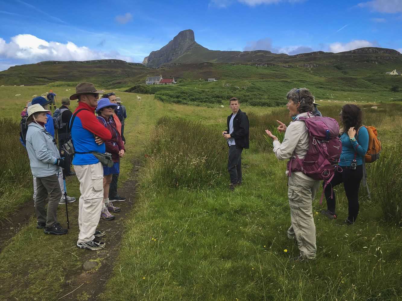 Loch Nevis shimmered green and blue in the early morning sun as we slipped away from our berth at Inverie to make our way to the Isle of Eigg for our morning activities. Manx shearwaters and occasional puffins dotted on the water were spotted as we watched for wildlife. The transit gave the opportunity for Robin to give a talk called “Natural Scotland”, explaining in a poetic manner the interrelationship between the rocks, plants, trees, birds, wildlife and people of the country.
