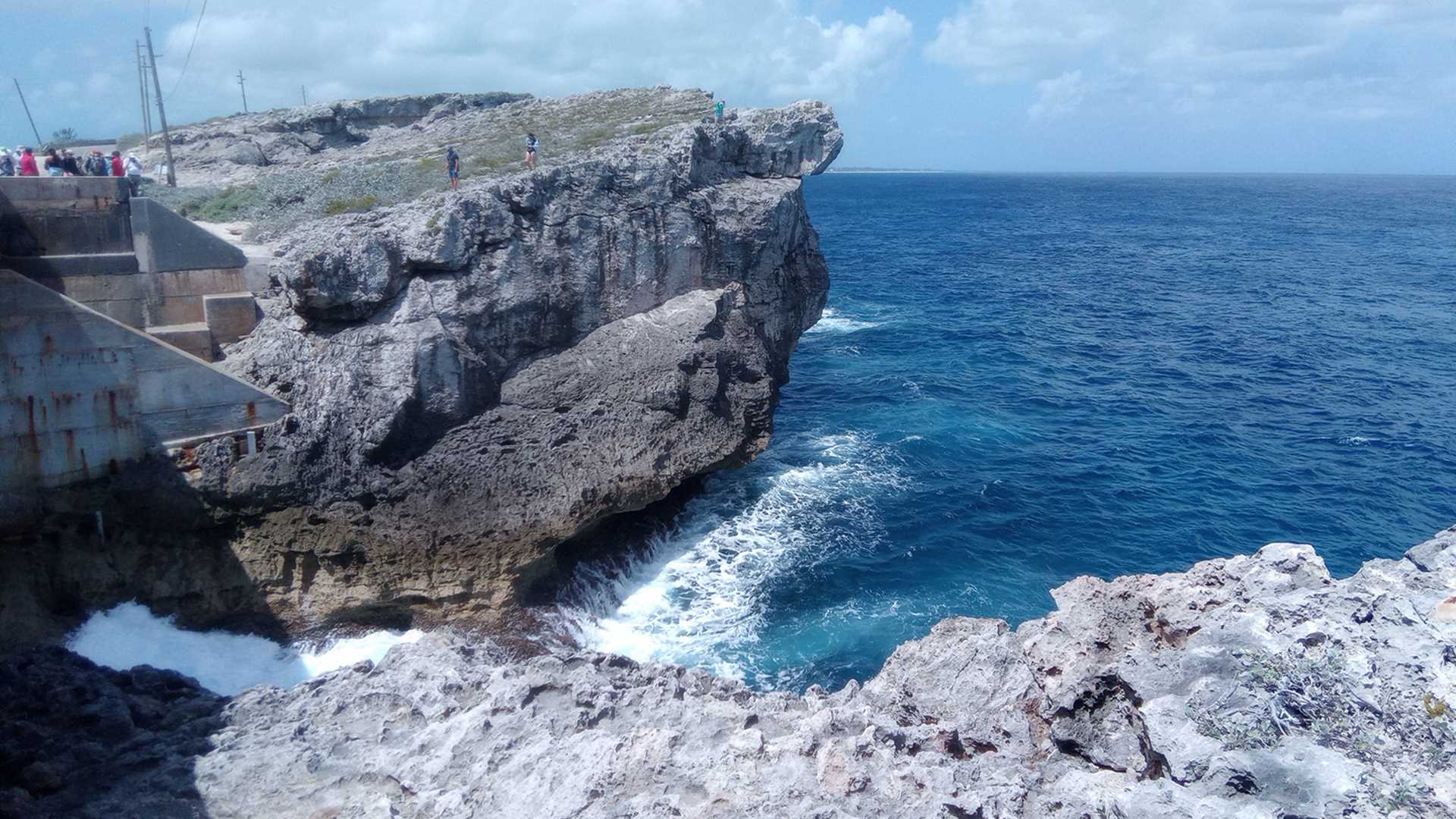 The next stop on our list of great places to see was the narrowest part of the island, spanned by a bridge called the Glass Window Bridge. Directly below this bridge, a strip of limestone connects the north and south ends of Eleuthera. At low tide, this strip separates two bodies of water. The Bahama Banks are turquoise green and shallow with visible waves of oolitic sands. The Atlantic Ocean is an intense cobalt blue. Massive limestone walls rise steeply from the Atlantic on either side of the bridge and stretch along the shore for miles.