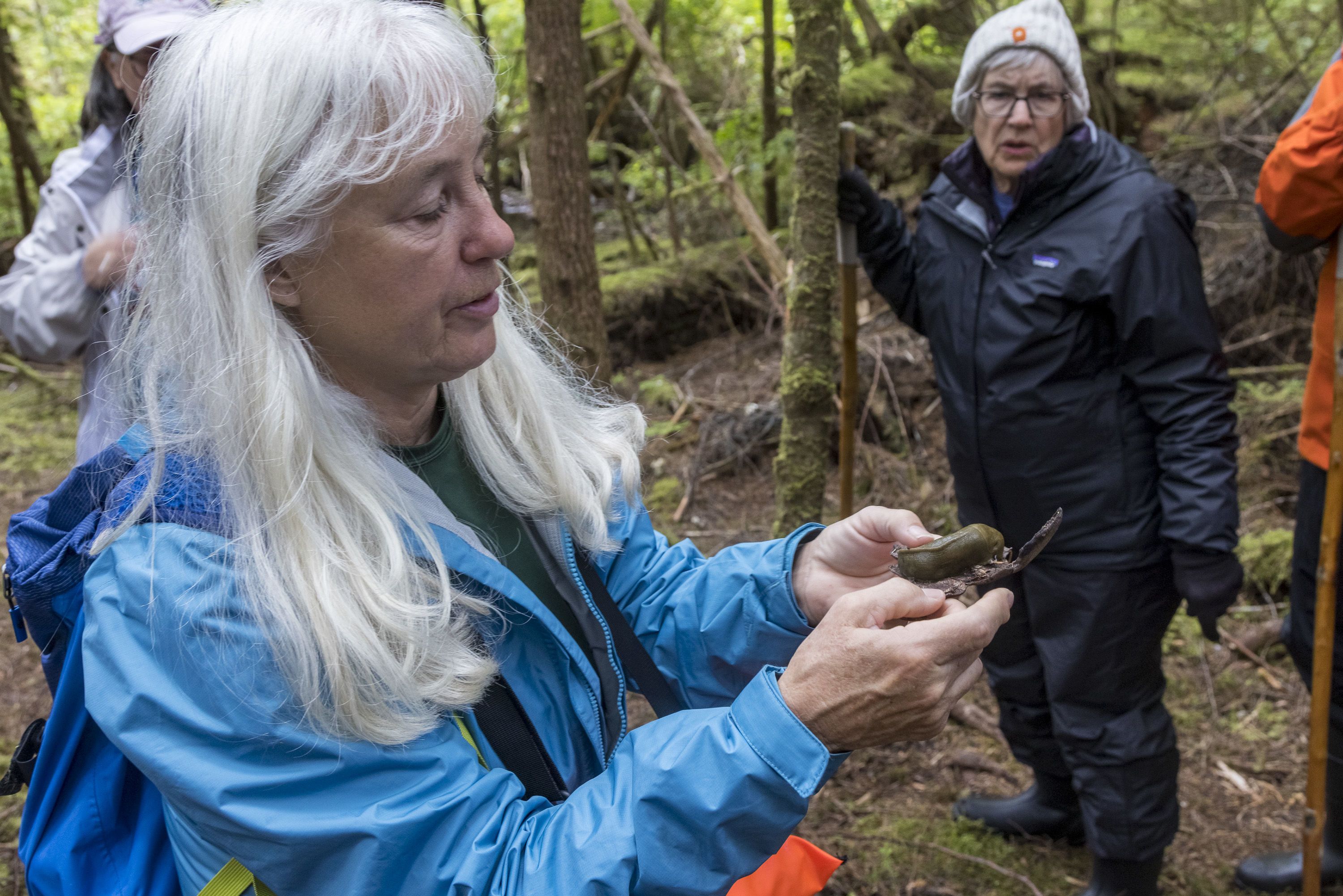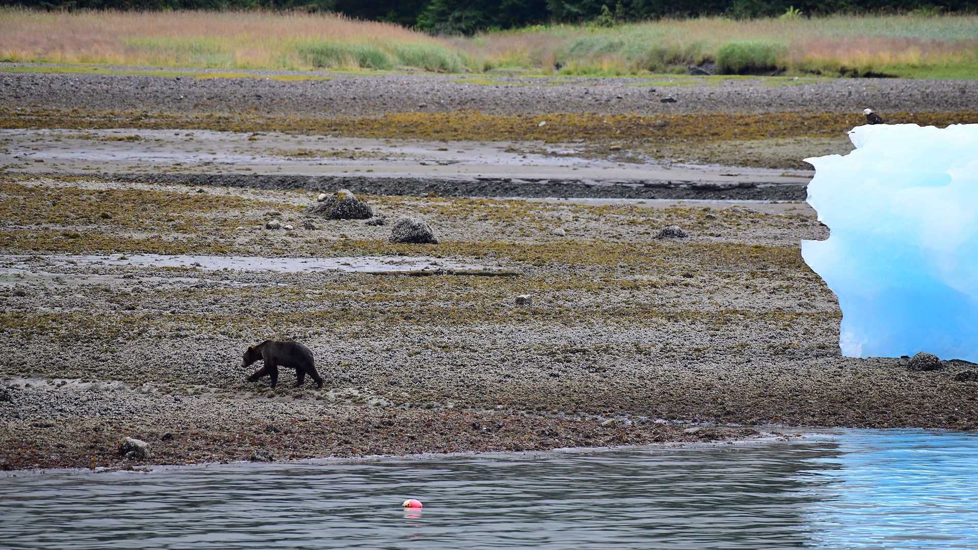 Wow, what an introduction to Southeast Alaska! Our day started at Holkham Bay, crossing the bar surrounded by surf scoters, Bonaparte’s gull, loons, marbled murrelets, and pigeon guillemots. As we started down Endicott Arm, we were soon interrupted by two brown bears and a multitude of bald eagles along the shoreline. One brown bear searched at the foot of an iceberg left high and dry by the tide as a bald eagle watched from atop—a quintessential Southeast Alaskan view.