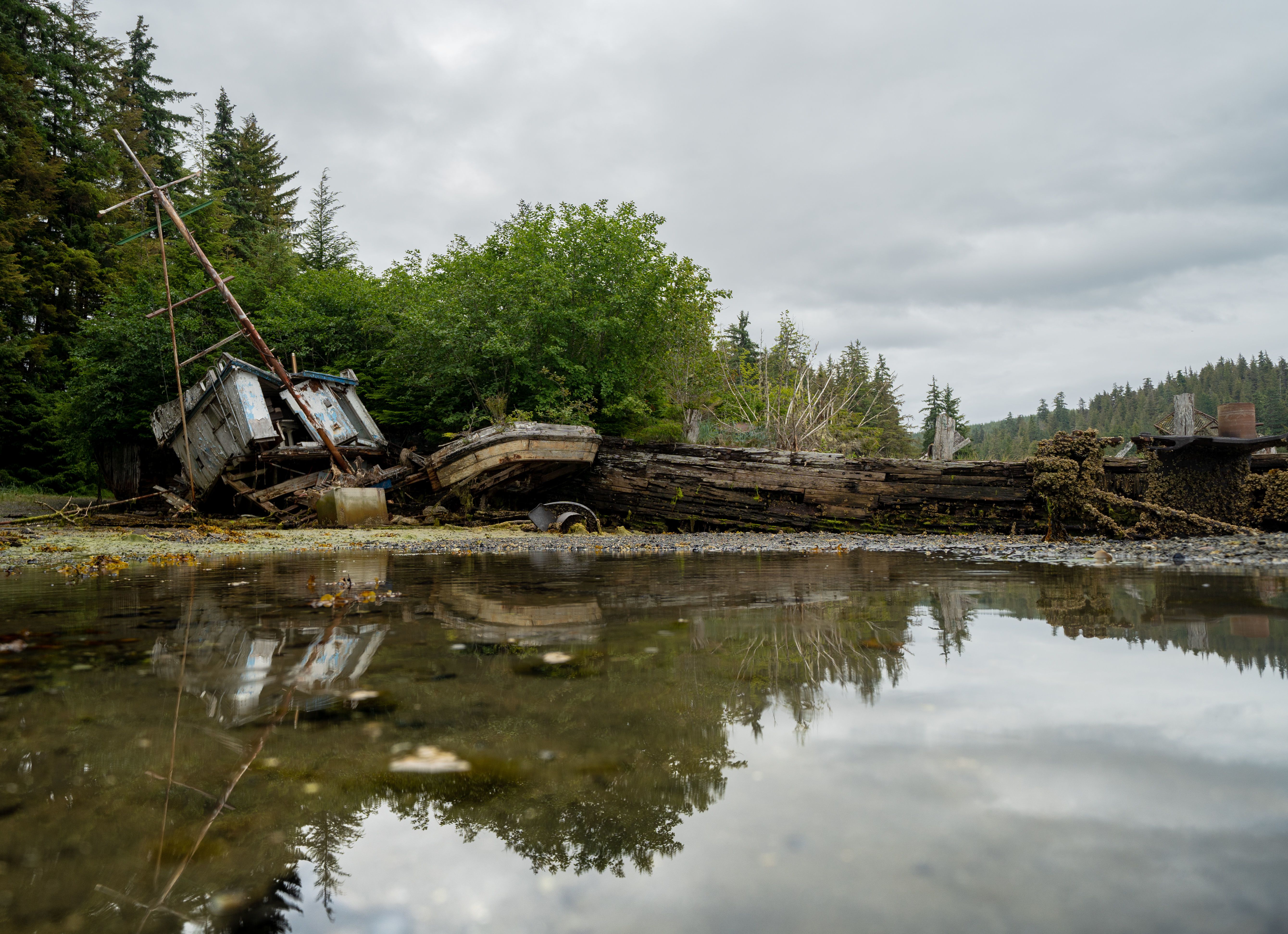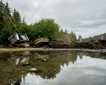 Afterward, we continued our sail to the head of the arm where the Dawes Glacier awaited us. Our afternoon schedule of activities involved an inflatable boat ride through icy water littered with brash ice (small remnants of ice from the face of the glacier), bergy bits (larger pieces of chunk ice), and colossal white and blue icebergs, with surfaces flat enough to walk on. Some bergs were populated by harbor seals, marine mammals highly adaptive to this environment who raised their heads as we whizzed by at a distance sufficient to not startle them. We were thrilled and elated at each thunderous creak and groan that the Dawes Glacier produces, and marveled as sheets of ice showered from the face. We stared at the cliff walls on either side of the glacier that towered hundreds of feet above us; these cliffs had a distinctive “bath tub ring” delineating bare rock below with rock showing the first signs of forest succession above. This once mighty glacier formed by the Stikine ice field is now beating a hasty retreat.