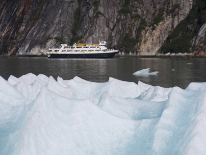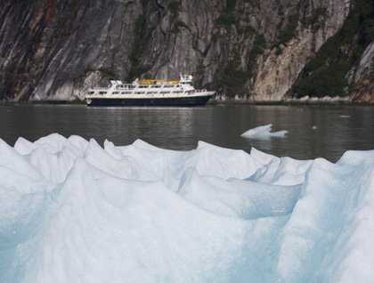 And we had a marvelous day on which to enjoy it. Early in the morning we crept through thick fog, but by breakfast this had burned off to reveal deep blue sky. Snowy peaks looked blindingly white in the sunshine. Brightly lit cliffs towered all around us. Deep shadows accentuated striations that scored their sides. Icebergs gleamed. Some were vast, looking like buildings or landscapes, others were diminutive, like lacey swans. And at last we saw their source – the Dawes Glacier. This river of ice runs down from the peaks along the Canadian border, carrying a bit of winter down to the moderate Northwest Coast.