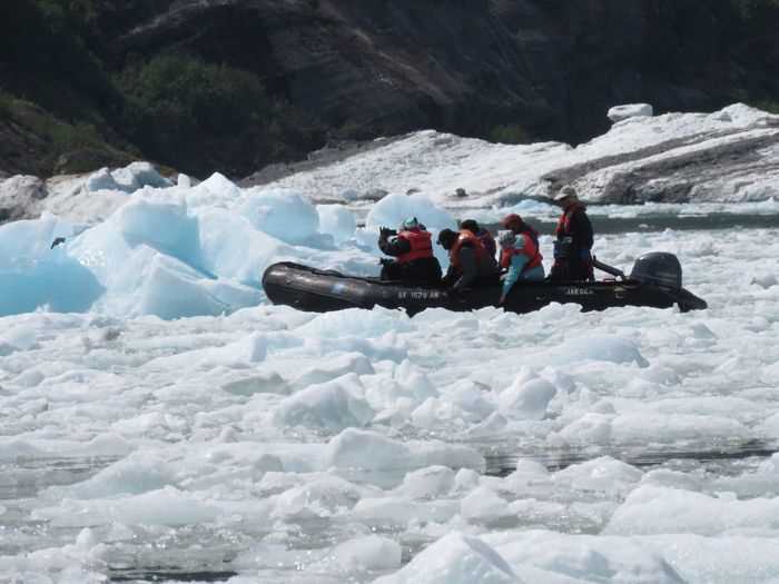 National Geographic Sea Bird crosses the terminal moraine in Holkham Bay amidst Arctic terns early this morning. Sculpted glacial ice of various sizes, shapes, and hues thicken as we enter and proceed up Endicott Arm. We explore the last part of the arm by Zodiac to gain spectacular views of the Dawes Glacier, one of the few remaining tidewater glaciers in Southeast Alaska. We kayak away the afternoon in Seven Mile Cove, absorbing the grandeur of the surrounding landscape. It is the final feather in our caps as our trip and time together come to a close.